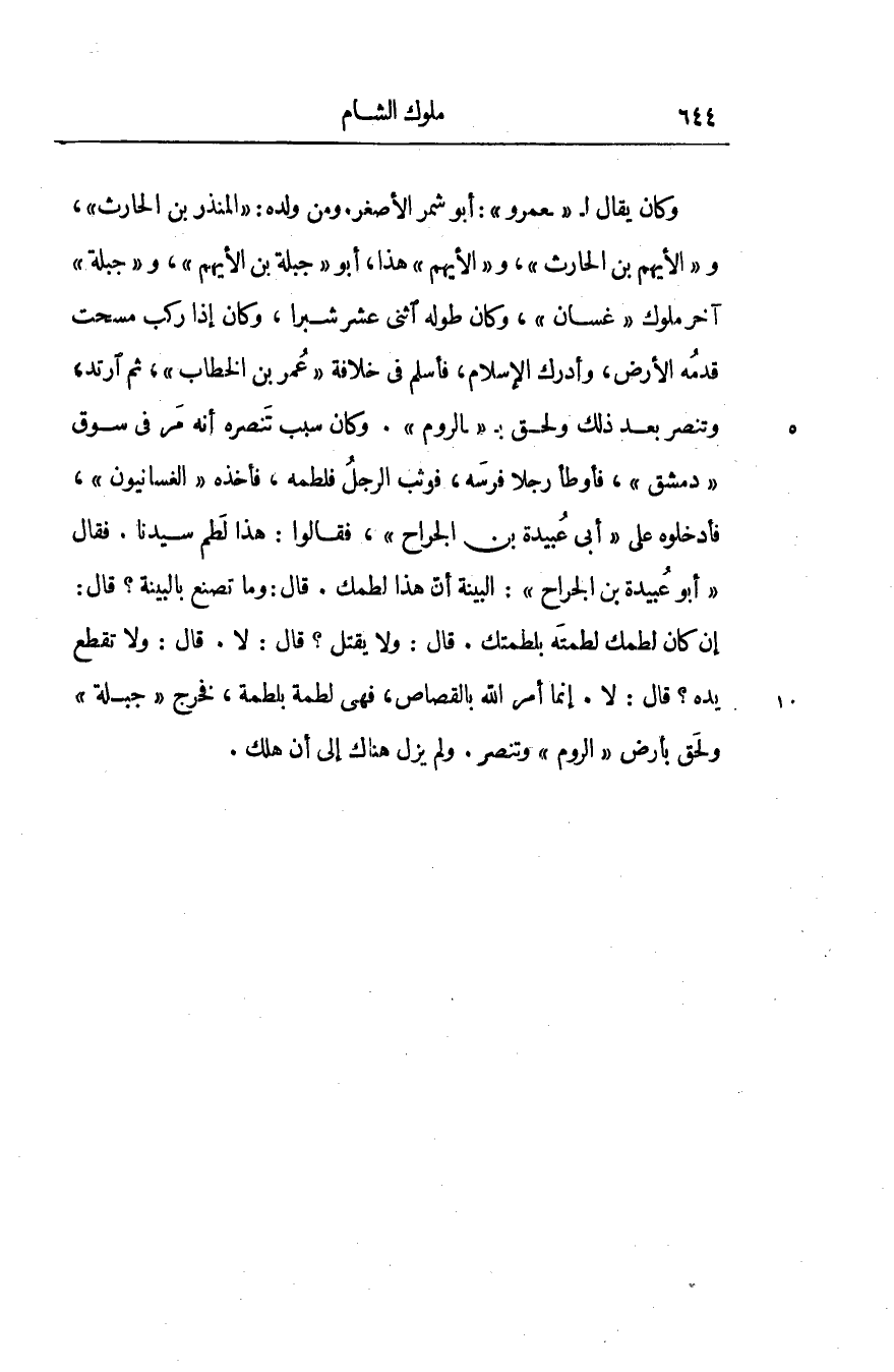 وكان يقال ل «عمرو» : أبو شمر الأصغر. ومن ولده: «المنذر بن الحارث» ، و «الأيهم بن الحارث» ، و «الأيهم» هذا، أبو «جبلة بن الأيهم» ، و «جبلة» آخر ملوك «غسان» ، وكان طوله اثنى عشر شبرا، وكان إذا ركب مسحت قدمه الأرض، وأدرك الإسلام، فأسلم في خلافة «عمر بن الخطاب» ، ثم ارتد، وتنصر بعد ذلك ولحق ب «الروم» . وكان سبب تنصره أنه مر في سوق «دمشق» ، فأوطأ رجلا فرسه، فوثب الرجل فلطمه، فأخذه «الغسانيون» ، فأدخلوه على «أبى عبيدة بن الجراح» ، فقالوا: هذا لطم سيدنا. فقال «أبو عبيدة بن الجراح» : البينة أنّ هذا لطمك. قال: وما تصنع بالبينة؟ قال: