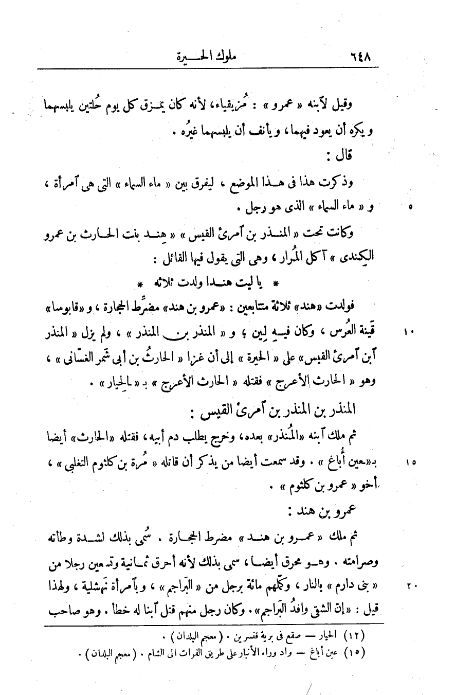 يا ليت هندا ولدت ثلاثة فولدت «هند» ثلاثة متتابعين: «عمرو بن هند» مضرّط الحجارة، و «قابوسا» قينة العرس، وكان فيه لين، و «المنذر بن المنذر» ، ولم يزل «المنذر ابن امرئ القيس» على «الحيرة» إلى أن غزا «الحارث بن أبى شمر الغسّانى» ، وهو «الحارث الأعرج» فقتله «الحارث الأعرج» ب «الحيار» «1» .