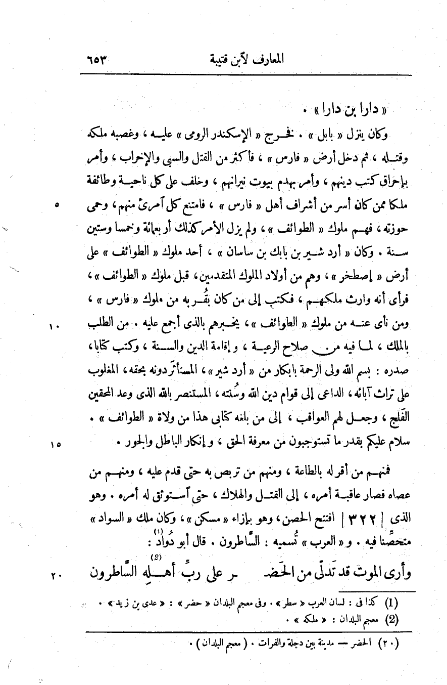 فمنهم من أقر له بالطاعة، ومنهم من تربص به حتى قدم عليه، ومنهم من عصاه فصار عاقبة أمره، إلى القتل والهلاك، حتى استوثق له أمره. وهو الّذي/ 322/ افتتح الحصن، وهو بإزاء «مسكن» ، وكان ملك «السواد» متحصّنا فيه. و «العرب» تسميه: السّاطرون. قال أبو دواد [1] :