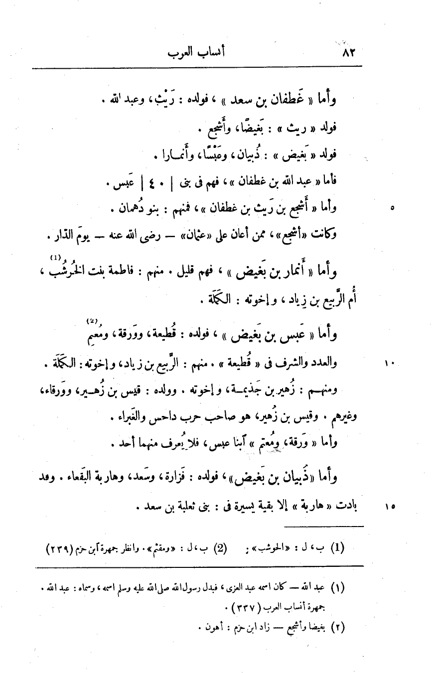 وأما «غطفان بن سعد» ، فولده: ريث، وعبد الله. «1» فولد «ريث» : بغيضا، وأشجع. «2» فولد «بغيض» : ذبيان، وعبسا، وأنمارا.