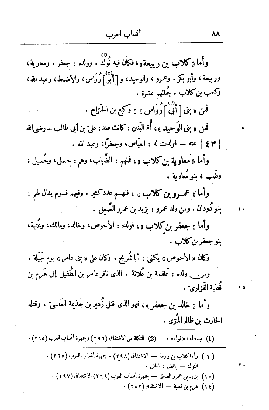 وأما «كلاب بن ربيعة» «1» ، فكان فيه نوك [1] . وولده: جعفر. ومعاوية، وربيعة، وأبو بكر. وعمرو، والوحيد، و [أبو [2] رواس، والأضبط، وعبد الله، وكعب بن كلاب. جملتهم عشرة.