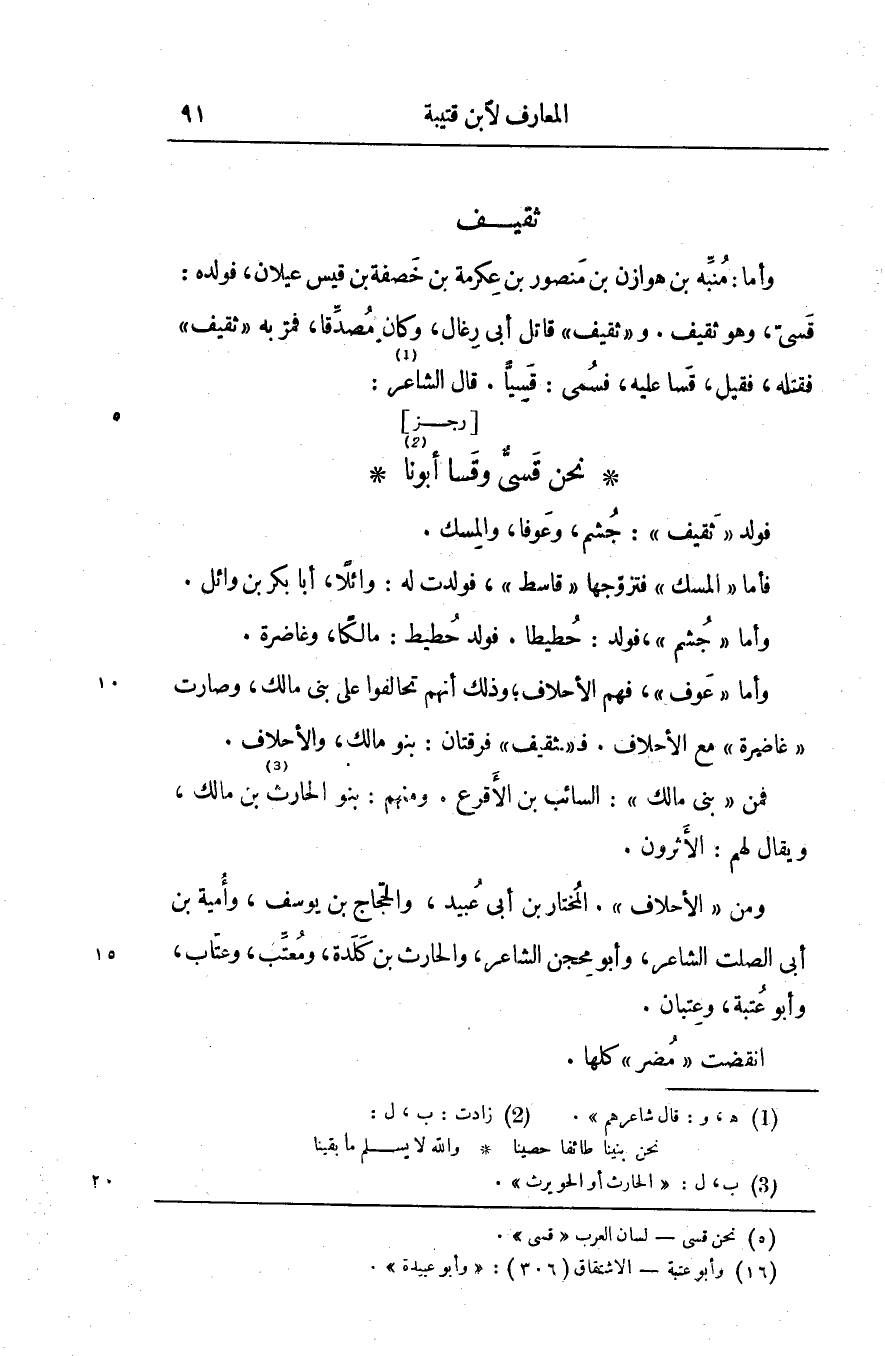 وأما «عوف» ، فهم الأحلاف وذلك أنهم تحالفوا على بنى مالك، وصارت «غاضرة» مع الأحلاف. ف «ثقيف» فرقتان: بنو مالك، والأحلاف.