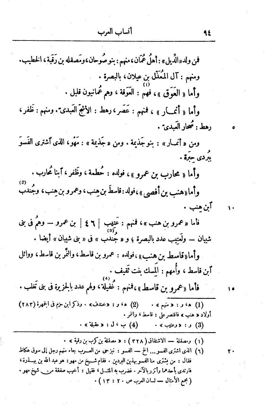 فأما «عمرو بن هنب» ، فمنهم: عتيب/ 46/ بن عمرو- وهم في بنى شيبان- ولعتيب عدد بالبصرة و «جندب» [3] في «بنى شيبان» أيضا.