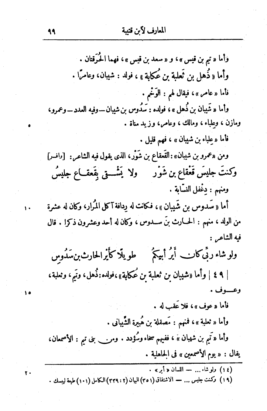 ومن «عمرو بن شيبان» : القعقاع بن شور، الّذي يقول فيه الشاعر: [وافر]