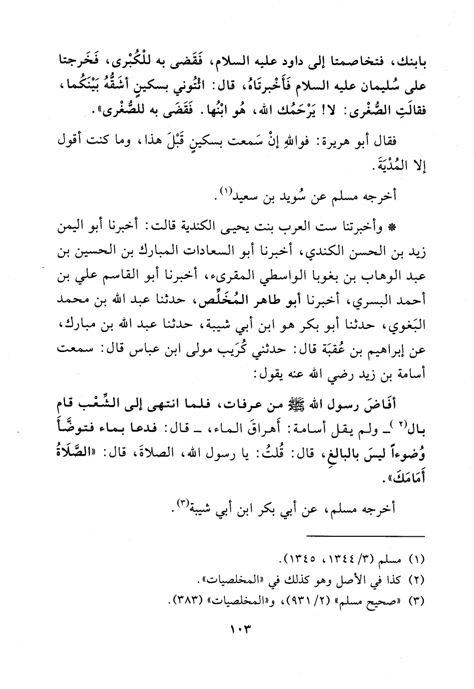 - وأخبرتنا ست العرب بنت يحيى الكندية قالت: أخبرنا أبو اليمن زيد بن الحسن الكندي، أخبرنا أبو السعادات المبارك بن الحسين بن عبد الوهاب بن بغوبا الواسطي المقرىء، أخبرنا أبو القاسم علي بن أحمد البسري، أخبرنا أبو طاهر المخلص، حدثنا عبد الله بن محمد البغوي، حدثنا أبو بكر هو ابن أبي شيبة، حدثنا عبد الله بن المبارك، عن إبراهيم بن عقبة قال: حدثني كريب مولى ابن عباس قال: سمعت أسامة بن زيد رضي الله عنه يقول: