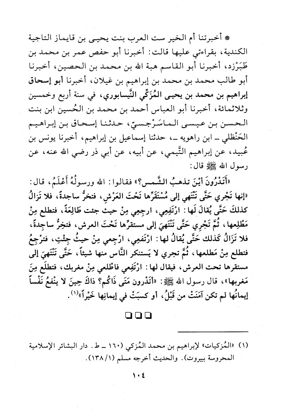 "أتدرون أين تذهب الشمس؟ " فقالوا: الله ورسوله أعلم، قال: "إنها تجري حتى تنتهي إلى مستقرها تحت العرش، فتخر ساجدة، فلا تزال كذلك حتى يقال لها: ارتفعي، ارجعي من حيث جئت طالعة، فتطلع من مطلعها، ثم تجري حتى تنتهي إلى مستقرها تحت العرش، فتخر ساجدة، فلا تزال كذلك حتى يقال لها: ارتفعي، ارجعي من حيث جئت، فترجع فتطلع من مطلعها، ثم تجري لا يستنكر الناس منها شيئا، حتى تنتهي إلى مستقرها تحت العرش، فيقال لها: ارتفعي فاطلعي من مغربك، فتطلع من مغربها"، قال رسول الله صلى الله عليه وسلم: "أتدرون متى ذاكم؟ ذاك حين لا ينفع نفسا إيمانها لم تكن آمنت من قبل، أو كسبت في إيمانها خيرا".