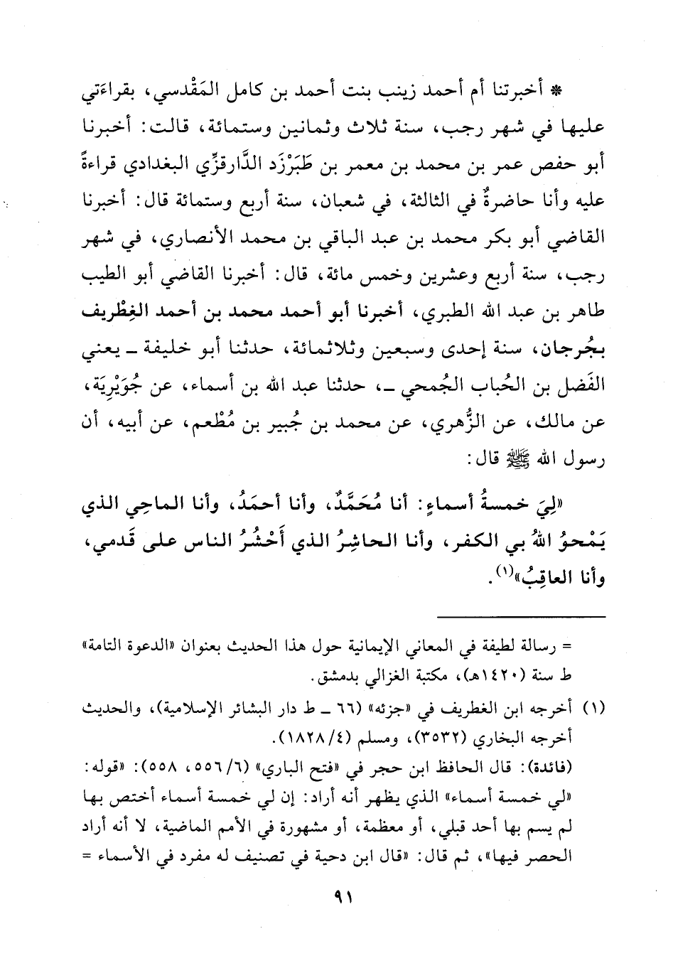"لي خمسة أسماء: أنا محمد، وأنا أحمد، وأنا الماحي الذي يمحو الله بي الكفر، وأنا الحاشر الذي أحشر الناس على قدمي، وأنا العاقب".
