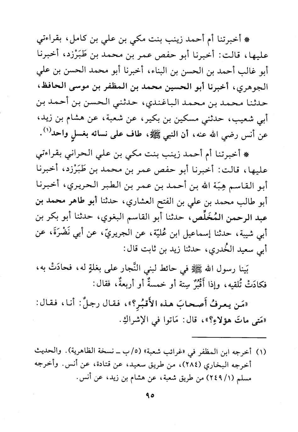 - أخبرتنا أم أحمد زينب بنت مكي بن علي بن كامل، بقراءتي عليها، قالت: أخبرنا أبو حفص عمر بن محمد بن طبرزد، أخبرنا أبو غالب أحمد بن الحسن بن البناء، أخبرنا أبو محمد الحسن بن علي الجوهري، أخبرنا أبو الحسين محمد بن المظفر بن موسى الحافظ، حدثنا محمد بن محمد الباغندي، حدثني الحسن بن أحمد بن أبي شعيب، حدثني مسكين بن بكير، عن شعبة، عن هشام بن زيد، عن أنس رضي الله عنه، أن النبي صلى الله عليه وسلم، طاف على نسائه بغسل واحد.