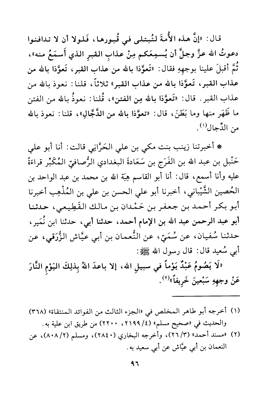 - أخبرتنا زينب مكي بن علي الحراني قالت: أنا أبو علي حنبل بن عبد الله بن الفرج بن سعادة البغدادي الرصافي المكبر قراءة عليه وأنا أسمع، قال: أنا أبو القاسم هبة الله بن محمد بن عبد الواحد بن الحصين الشيباني، أخبرنا أبو علي الحسن بن علي بن المذهب أخبرنا أبو بكر أحمد بن جعفر بن حمدان بن مالك القطيعي، حدثنا أبو عبد الرحمن عبد الله بن الإمام أحمد، حدثنا أبي، حدثنا ابن نمير، حدثنا سفيان، عن سمي، عن النعمان بن أبي عياش الزرقي، عن أبي سعيد قال: قال رسول الله صلى الله عليه وسلم: "لا يصوم عبد يوما في سبيل الله، إلا باعد الله بذلك اليوم النار عن وجهه سبعين خريفا".