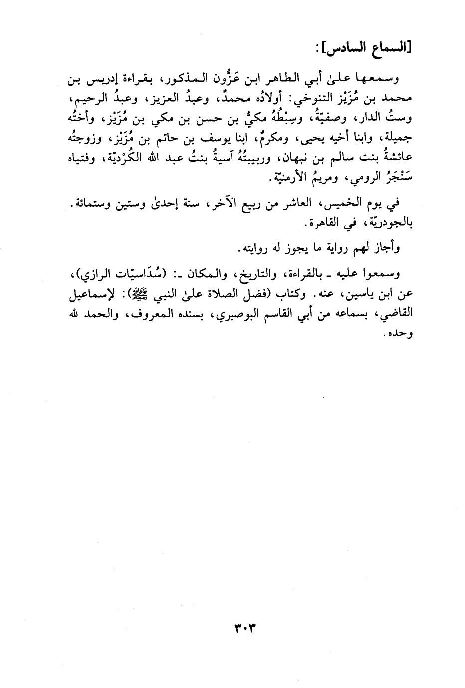 وسمعها عَلَى الشَّيْخ معِين الدّين أَبِي الْعَبَّاس أَحْمَد ابْن القَاضِي زين الدّين عَليّ بْن يُوسُف بْن بنْدَار الدِّمَشْقِي بِسَمَاعِهِ من ابْن ياسين بِقِرَاءَة أَحْمَد بْن فَرح اللَّخْمِيّ ابْن أخي المسمع شمس الدّين أَبُو عَبْد اللَّه مُحَمَّد بْن جمال الدّين أَبِي بكر عَبْد اللَّه بْن عَليّ