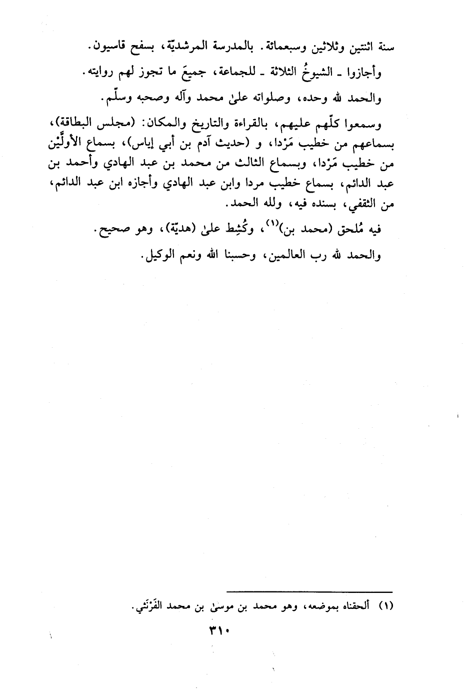 أَحْمَد بْن معن الْقطَّان الضَّرِير وتقي الدّين مُحَمَّد ابْن الشَّيْخ قطب الدّين مُوسَى ابْن الشَّيْخ الْفَقِيه أَبِي عَبْد اللَّه مُحَمَّد بْن أَبِي الْحُسَيْن أَحْمَد بْن عَبْد اللَّه اليونيني وَابْنه مُوسَى فِي أول الْخَامِسَة وَمَعَهُ عَبْد الرَّحْمَن بْن أَحْمَد بْن حُسَيْن بْن أَبِي الْحسن اليونيني والحاج أَبُو بكر بْن عُثْمَان بْن مُوسَى قيم المرشدية وَزَوجته هَدِيَّة بنت أَبِي الْمجد ابْن عُثْمَان النساج وَمُحَمّد بْن مُحَمَّد بْن أَبِي بكر بْن أَحْمَد بْن عَبْد الدَّائِم بْن نعْمَة بْن أَحْمَد الْمَقْدِسِي وَمُحَمّد وَسليمَان وَأَبُو بكر أَوْلَاد بهاء الدّين عَبْد الرَّحْمَن ابْن قَاضِي الْقُضَاة عز الدّين مُحَمَّد بْن سُلَيْمَان بْن حَمْزَة بْن أَحْمَد بْن عمر ابْن الشَّيْخ أَبِي عمر وَالصَّلَاح إِبْرَاهِيم وَمُحَمّد الصَّغِير ابْنا الشَّيْخ أَحْمَد بْن مُحَمَّد بْن علوان الإخميمي الْمصْرِيّ وَالشَّيْخ عَبْد الرَّحِيم بْن الشَّيْخ عُثْمَان بْن عَليّ الطباخ أَبوهُ وَمن يَأْتِي ذكره وشمس الدّين حسن بْن شهَاب الدّين عَبْد اللَّه بْن ال بْنُ عَلِيِّ بْنِ مُحَمَّدِ بْنِ عمر بْن عَبْد الرَّحْمَن بْن هِلَال الْأَزْدِيّ وَالشَّيْخ مُحَمَّد بْن عَبْد الرَّحْمَن بْن مُحَمَّد بْن عَبْد الرَّحْمَن بْن نوح الْمَقْدِسِي وولداه عَبْد الرَّحْمَن فِي الْخَامِسَة وَعَائِشَة فِي الثَّانِيَة وأمهما المنى بنت لاجين عَتيق الرَّشِيدِيّ وبنتها فَاطِمَة بنت بكتاش بْن عَبْد اللَّه عَتيق مُحَمَّد بْن ياغان الشرفي وَمُحَمّد بْن التقي عَبْد اللَّه بْن الْعِمَاد إِبْرَاهِيم بْن القَاضِي نجم الدّين أَحْمَد بْن مُحَمَّد بْن خلف الْمَقْدِسِي وَاحْمَدْ ويوسف ابْنا الشَّيْخ عز الدّين أَبِي الْعِزّ بْن أَحْمَد بْن أَبِي الْعِزّ بْن صَالح بْن وهيب الْحَنَفِيّ وَأَبُو بكر وَحسن وَإِبْرَاهِيم أَوْلَاد عماد الدّين أَحْمَد بْن عَبْد الْهَادِي بْن عَبْد الحميد الْمَقْدِسِي وَمُحَمّد بْن الشَّيْخ الْعَلامَة شرف الدّين أَحْمَد بْن حسن بْن عَبْد اللَّه ابْن الشَّيْخ أَبِي عمر وَعلي بْن نَاصِر الدّين مُحَمَّد بْن مُحَمَّد ابْن الشَّيْخ فَخر الدّين عَليّ بْن أَحْمَد بْن عَبْد الْوَاحِد ابْن البُخَارِيّ وشهاب الدّين أَحْمَد بْن عَبْد اللَّه بْن بلبان الْخياط عَتيق القَاضِي شمس الدّين عَبْدُ اللَّهِ بْنُ مُحَمَّدِ بْنِ عَطاء الْحَنَفِيّ وَابْنه مُحَمَّد وَالشَّيْخ مُحَمَّد بْن مُحَمَّد بْن منكداش بْن ياغان المارديني الْخياط وَمُحَمّد بْن عمر بْن مُحَمَّد بْن شرف الزرعي الْخياط وزين الدّين خضر بْن مُحَمَّد بْن عُثْمَان بْن ياغان وابناه مُحَمَّد وَعلي فِي الرَّابِعَة وَحسن بْن إِسْمَاعِيل بْن مُحَمَّد بْن مكنا الصَّالِحِي وَأحمد ابْن