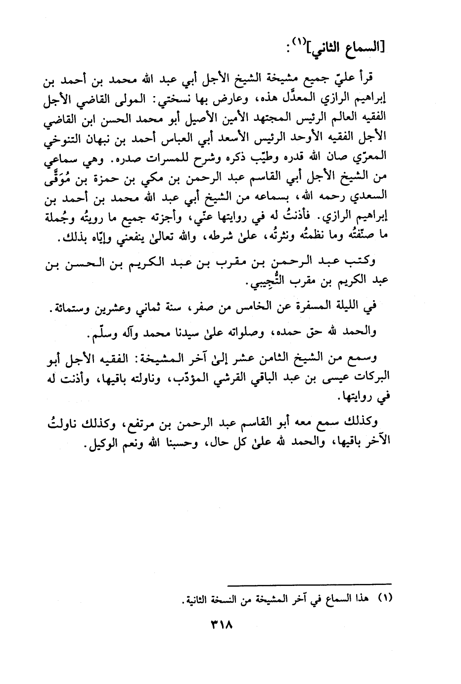 سمع هَذِهِ المشيخة جَمِيعهَا خلا الْكَلَام عَلَى الْأَحَادِيث عَلَى الشَّيْخ الْمسند الْأَصِيل عَليّ بْن برهَان الدّين الشَّيْخ إِبْرَاهِيم بْن أَحْمَد بْن عَبْد الْهَادِي بْن عَبْد الحميد بْن عَبْد الْهَادِي الْمَقْدِسِي بِسَمَاعِهِ فِيهَا أصلا بِقِرَاءَة الإِمَام الْمُحدث الرّحال صَلَاح الدّين خَلِيل بْن مُحَمَّد بْن مُحَمَّد الأقفهسي الْجَمَاعَة الإِمَام جمال الدّين عَبْد اللَّه بْن إِبْرَاهِيم بْن خَلِيل الشرائحي وَالْإِمَام نَاصِر الدّين أَبُو عَبْد اللَّه مُحَمَّد بْن عَبْد النَّعيم بْن مُحَمَّد ابْن القَاضِي تَقِيّ الدّين سُلَيْمَان بْن حَمْزَة الْمَقْدِسِي وَابْنه أَحْمَد فِي الرَّابِعَة حضر وَالشَّيْخ الْمُحدث بدر الدّين حسن بْن عَليّ بْن عمر الإسعردي وَمُحَمّد بْن أَحْمَد بْن مُحَمَّد بْن الشَّافِعِي وَله الْخط