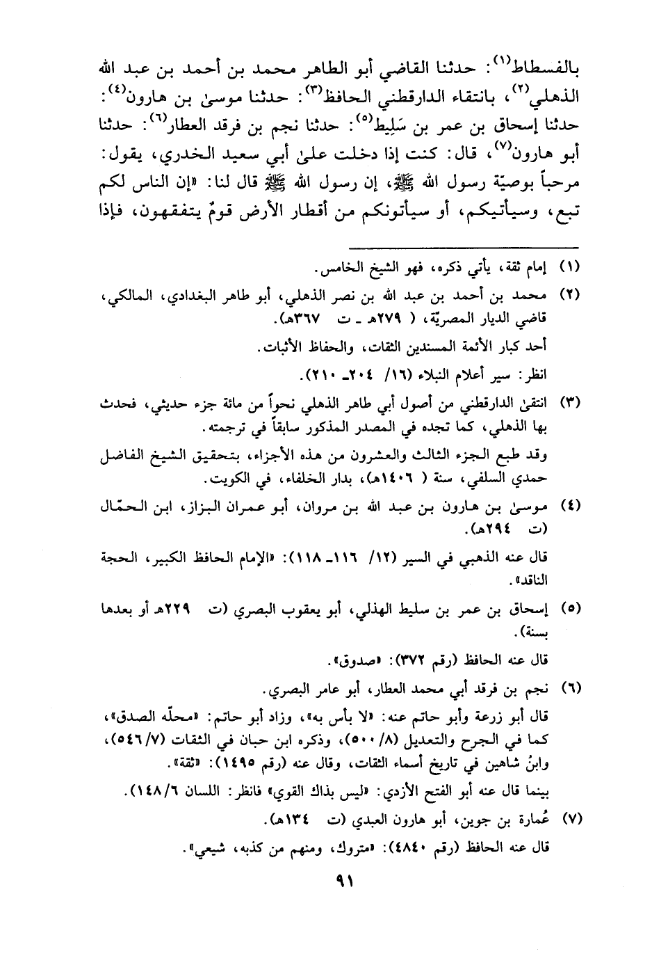 5 - أَخْبَرَنَا أَبُو الْقَاسِمِ عَلِيُّ بْنُ مُحَمَّدِ بْنِ عَلِيٍّ الْفَارِسِيُّ بِالْفُسْطَاطِ أَخْبَرَنَا أَبُو أَحْمَدَ عَبْدُ اللَّهِ بْنُ مُحَمَّدِ بْنِ شُجَاعٍ الْمَعْرُوفُ بِابْنِ الْمُفَسِّرِ الدِّمَشْقِيِّ حَدَّثَنَا أَبُو بَكْرٍ أَحْمَدُ بْنُ عَلِيِّ بْنِ سَعِيدٍ الْقَاضِي حَدَّثَنَا