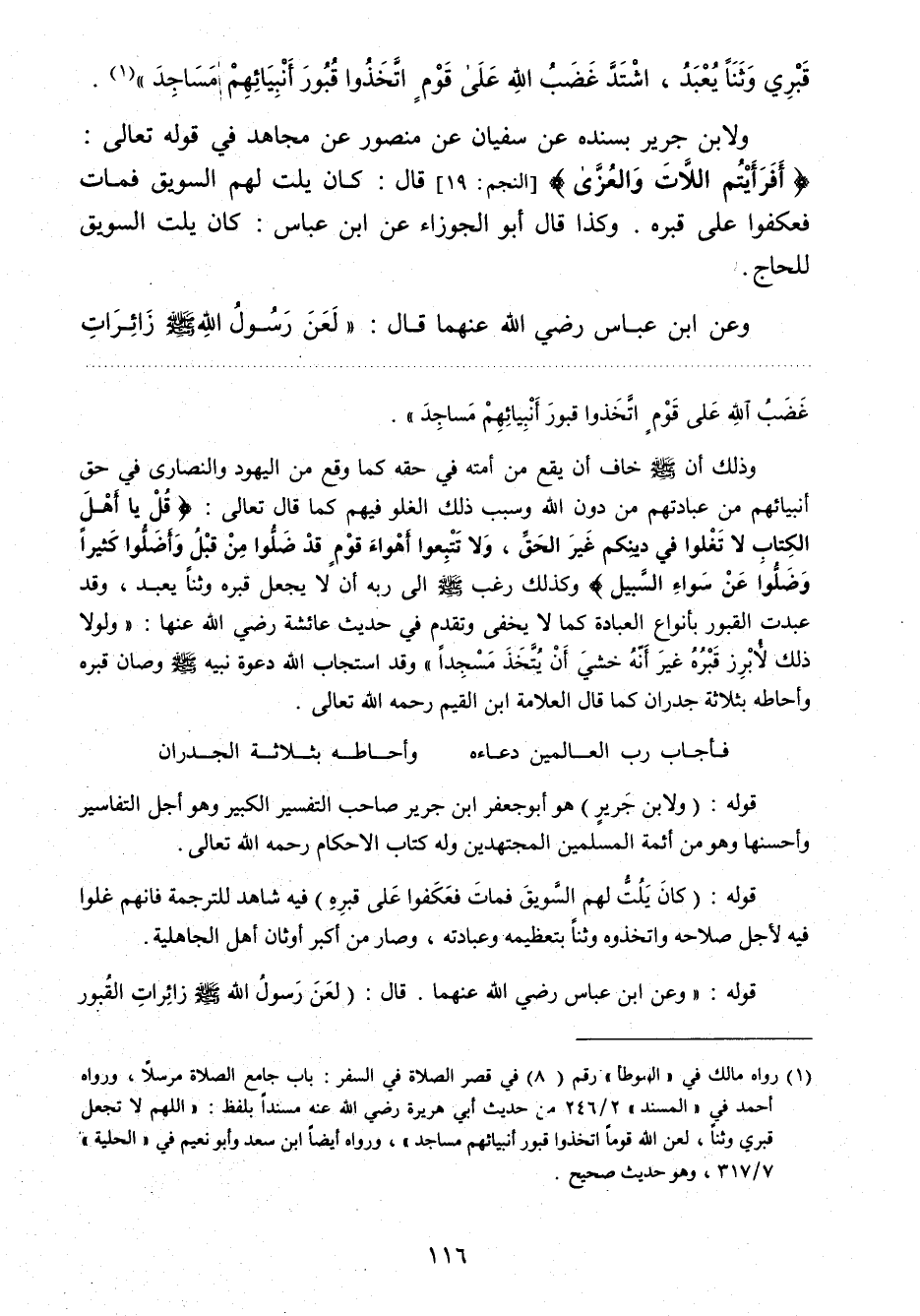 1 رواه مالك في " الموطأ" رقم (85) في قصر الصلاة في السفر: باب جامع الصلاة مرسلا , ورواه أحمد في "المسند" 2 / 246 من حديث أبي هريرة - رضي الله عنه - مسندا بلفظ: " اللهم لا تجعل قبري وثنا , لعن الله قوما اتخذوا قبور أنبيائهم مساجد " , ورواه أيضا ابن سعد وأبو نعيم في " الحلية 7/ 317 , وهو حديث صحيح.
