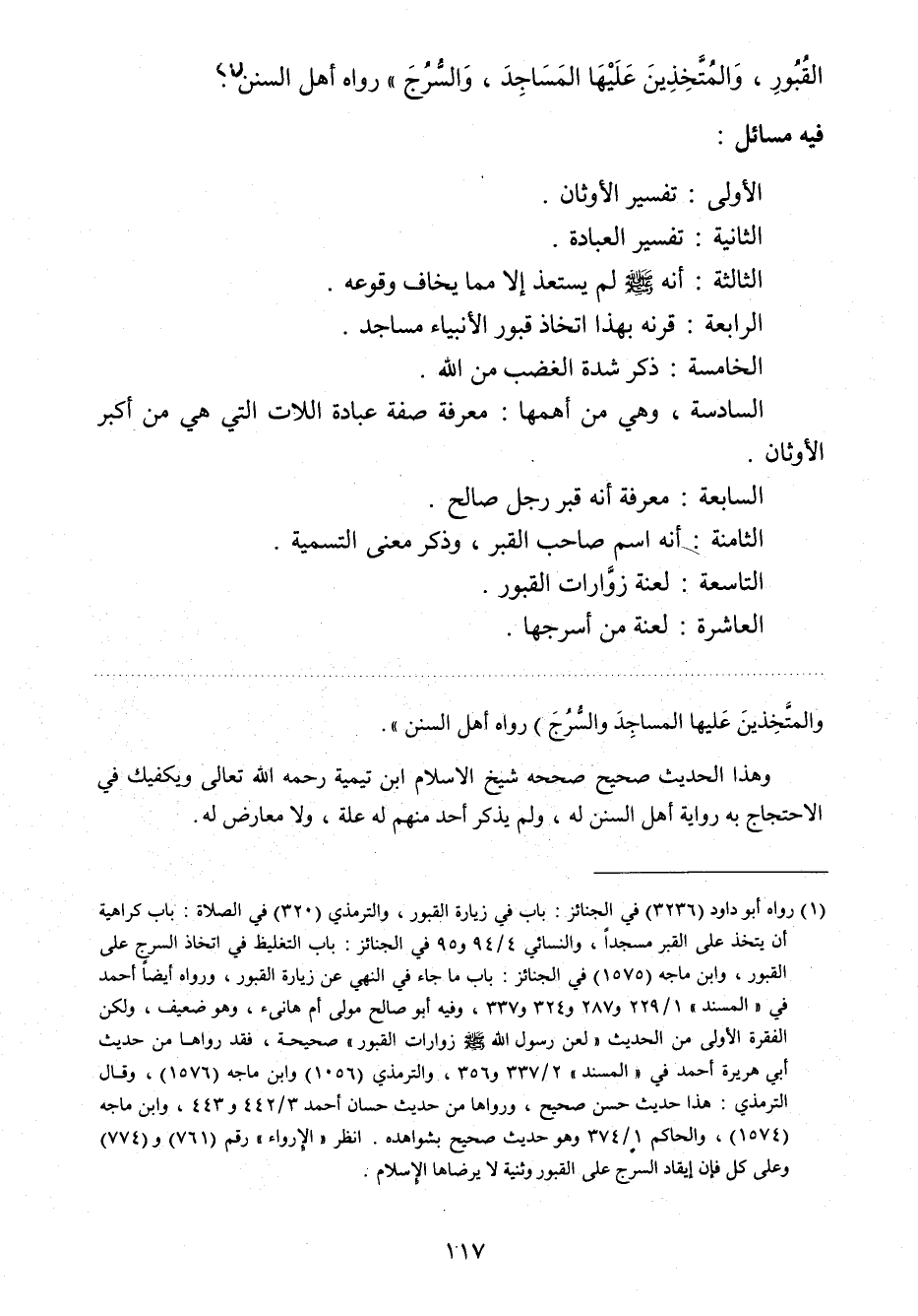 1 رواه أبو داود (3236) في الجنائز: باب في زيارة القبور , والترمذي (320) في الصلاة: باب كراهية أن يتخذ على القبر مسجدا , والنسائي 4/ 94 و 95 في الجنائز: باب التغليظ في اتخاذ السرج على القبور , وابن ماجه (1575) في الجنائز: باب ما جاء في النهي عن زيارة القبور , ورواه أيضا أحمد في"المسند" 1/229 و287 و 324 و337 , وفيه أبو صالح مولى أم هانئ , وهو ضعيف , ولكن الفقرة الأولى من الحديث " لعن رسول الله صلى الله عليه وسلم زوارات القبور " صحيحة , فقد رواها من حديث أبي هريرة أحمد في " المسند" 2/ 337 و 356 , والترمذي (1056) ، وابن ماجه (1576) , وقال الترمذي: هذا حديث حسن صحيح , ورواها من حديث حسان أحمد 3/ 442 و 443 , وابن ماجه (1574) , والحاكم 1/ 374 وهو حديث صحيح بشواهده. انظر " الإرواء" رقم (761) , (774) وعلى كل فإن إيقاد السرج على القبور وثنية لا يرضاها الإسلام.