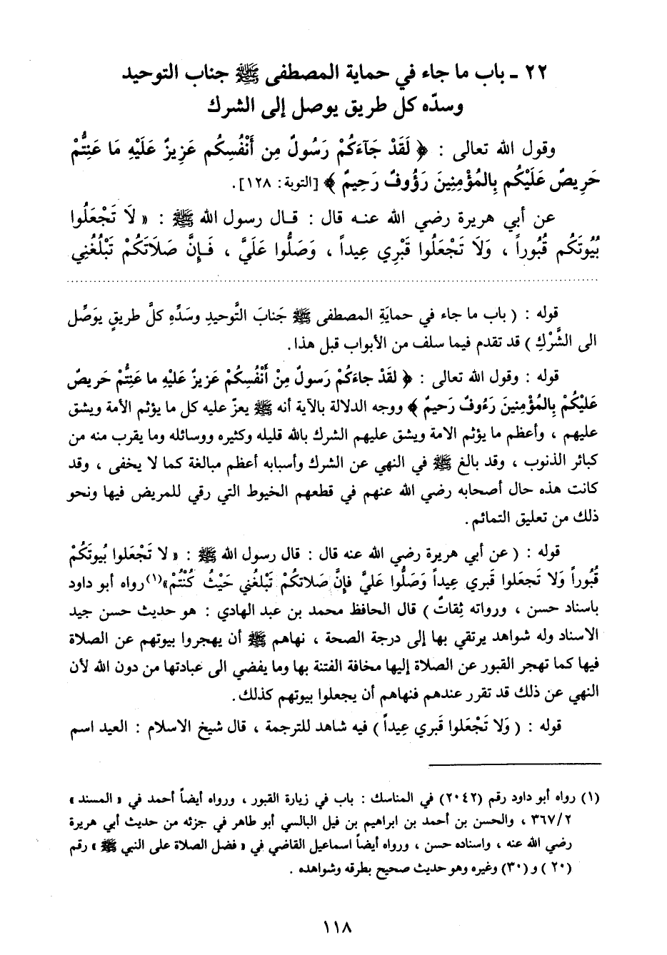 قوله: وقول الله تعالى: {لَقَدْ جَاءَكُمْ رَسُولٌ مِنْ أَنْفُسِكُمْ عَزِيزٌ عَلَيْهِ مَا عَنِتُّمْ حَرِيصٌ عَلَيْكُمْ بِالْمُؤْمِنِينَ رَؤُوفٌ رَحِيمٌ} 2 ووجه الدلالة بالآية أنه صلي الله عليه وسلم يعز عليه كل ما يؤثم الأمة ويشق عليهم، وأعظم ما يؤثم الأمة ويشق عليهم الشرك بالله قليله وكثيره ووسائله وما يقرب منه من كبائر الذنوب، وقد بالغ صلي الله عليه وسلم في النهي عن الشرك وأسبابه أعظم مبالغة كما لا يخفى، وقد كانت هذه حال أصحابه - رضي الله عنهم - في قطعهم الخيوط التي رقي للمريض فيها ونحو ذلك من تعليق التمائم. قوله: عن أبي هريرة رضي الله عنه قال: قال رسول الله:صلي الله عليه وسلم " لا تجعلوا بيوتكم قبورا ولا تجعلوا قبري عيدا وصلوا علي فإن صلاتكم تبلغني حيث كنتم "رواه أبو داود بإسناد حسن، ورواته ثقات. قال الحافظ محمد بن عبد الهادي: "هو حديث حسن جيد الإسناد وله شواهد يرتقي بها إلى درجة الصحة". نهاهم صلي الله عليه وسلم أن يهجروا بيوتهم عن الصلاة فيها كما تهجر القبور عن الصلاة إليها مخافة الفتنة بها وما يفضي إلى عبادتها من دون الله؛ لأن النهي عن ذلك قد تقرر عندهم فنهاهم أن يجعلوا بيوتهم كذلك.