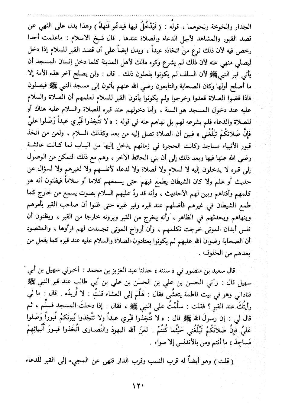 قال سعيد بن منصور في "سننه" حدثنا عبد العزيز بن محمد: أخبرني سهيل بن أبي سهيل قال: رآني الحسن بن علي بن الحسن بن علي بن أبي طالب عند قبر النبي صلي الله عليه وسلم فناداني وهو في بيت فاطمة يتعشى، فقال: هلم إلى العشاء قلت: لا أريده. قال: ما لي رأيتك عند القبر؟ فقلت: سلمت على النبي صلي الله عليه وسلم، فقال: إذا دخلت المسجد فسلم، ثم قال لي: إن رسول الله صلي الله عليه وسلم قال: " لا تتخذوا قبري عيدا ولا تتخذوا بيوتكم قبورا وصلوا علي فإن صلاتكم تبلغني حيثما كنتم. لعن الله اليهود والنصارى اتخذوا قبور أنبيائهم مساجد "ما أنتم ومن بالأندلس إلا سواء.