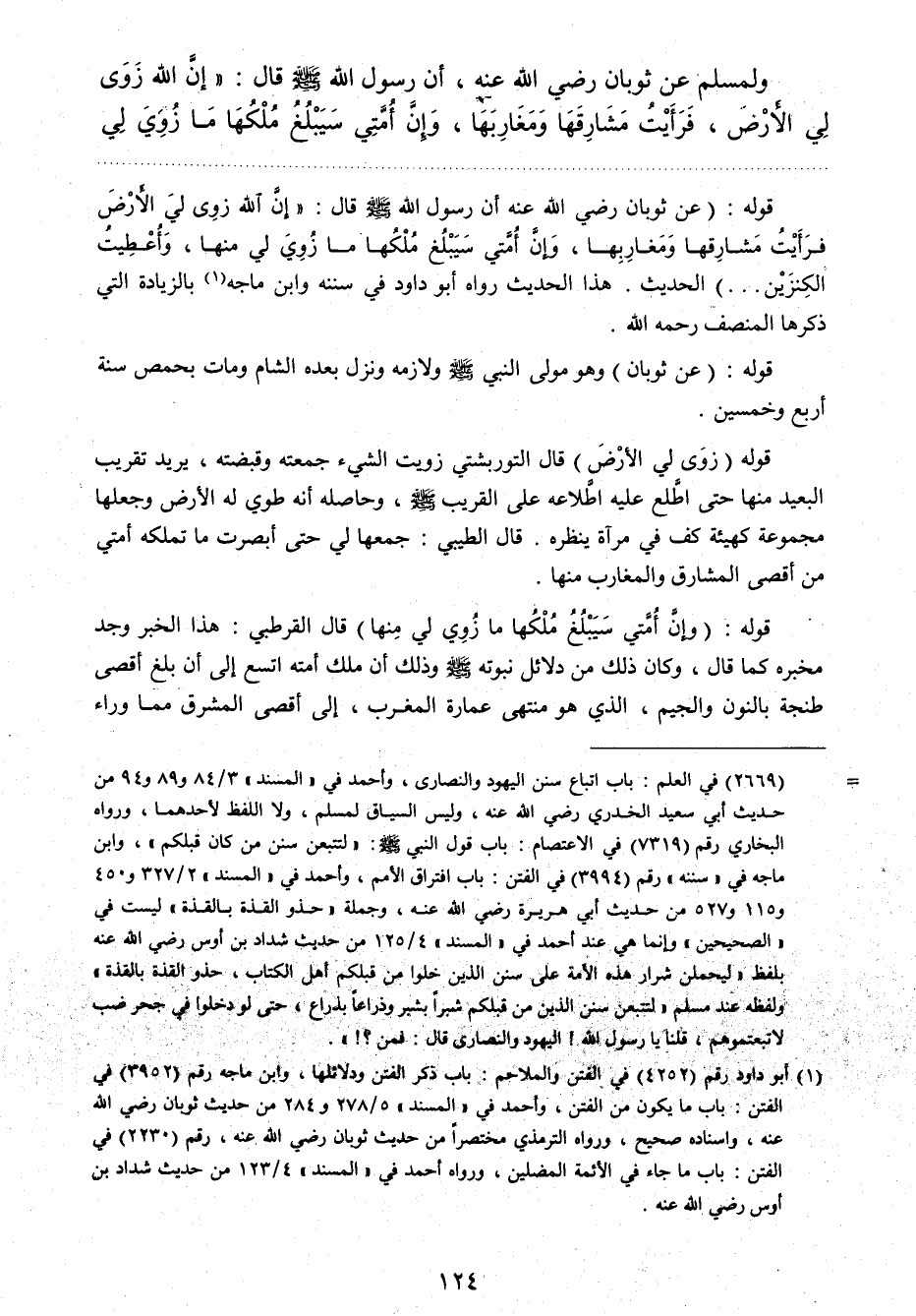 قوله: عن ثوبان رضي الله عنه أن رسول الله صلي الله عليه وسلم قال: " إن الله زوى لي الأرض فرأيت مشارقها ومغاربها، وإن أمتي سيبلغ ملكها ما زوي لي منها، وأعطيت الكنزين "الحديث. هذا الحديث رواه أبو داود في سننه وابن ماجه1 بالزيادة التي ذكرها المنصف رحمه الله.