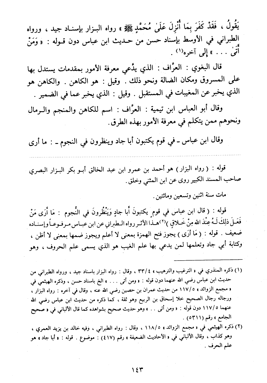 يقول، فقد كفر بما أنزل على محمد صلي الله عليه وسلم "رواه البزار بإسناد جيد، ورواه الطبراني في الأوسط بإسناد حسن من حديث ابن عباس دون قوله: " ومن أتى ... " إلى آخره 1.