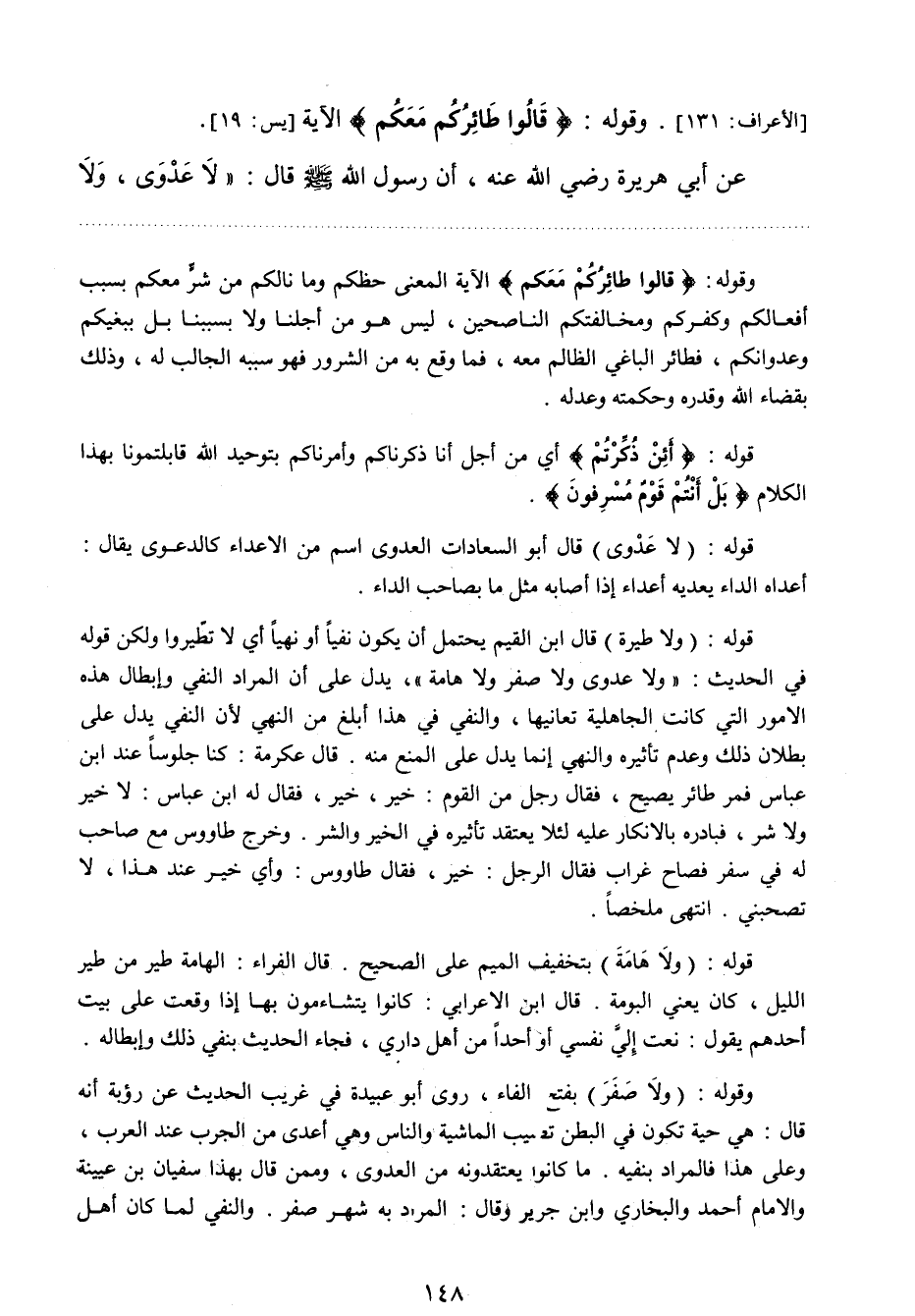 وقوله: {قَالُوا طَائِرُكُمْ مَعَكُمْ} 1 الآية. عن أبي هريرة رضي الله عنه أن رسول الله صلي الله عليه وسلم قال: " لا عدوى، ولا