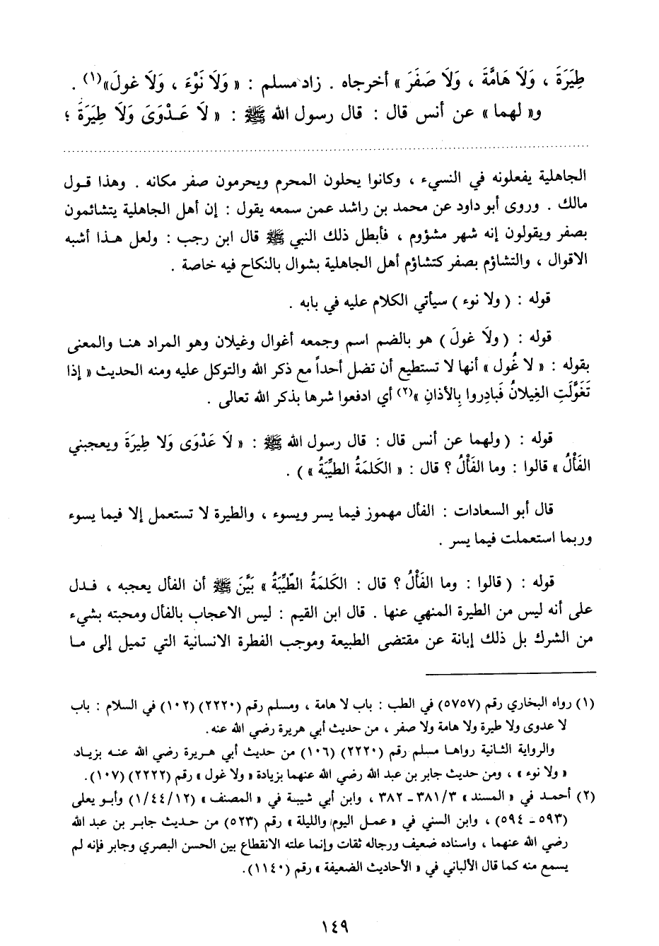 1 رواه البخاري رقم (5757) في الطب: باب لا هامة , ومسلم رقم (2220) (102) في السلام: باب لا عدوى ولا طيرة ولا هامة ولا صفر من حديث أبي هريرة رضي الله عنه. والرواية الثانية رواها مسلم رقم (2220) (106) من حديث أبي هريرة رضي الله عنه بزيادة: " ولا نوء " , ومن حديث جابر بن عبد الله رضي الله عنهما بزيادة: " ولا غول " رقم (2222) (107) .