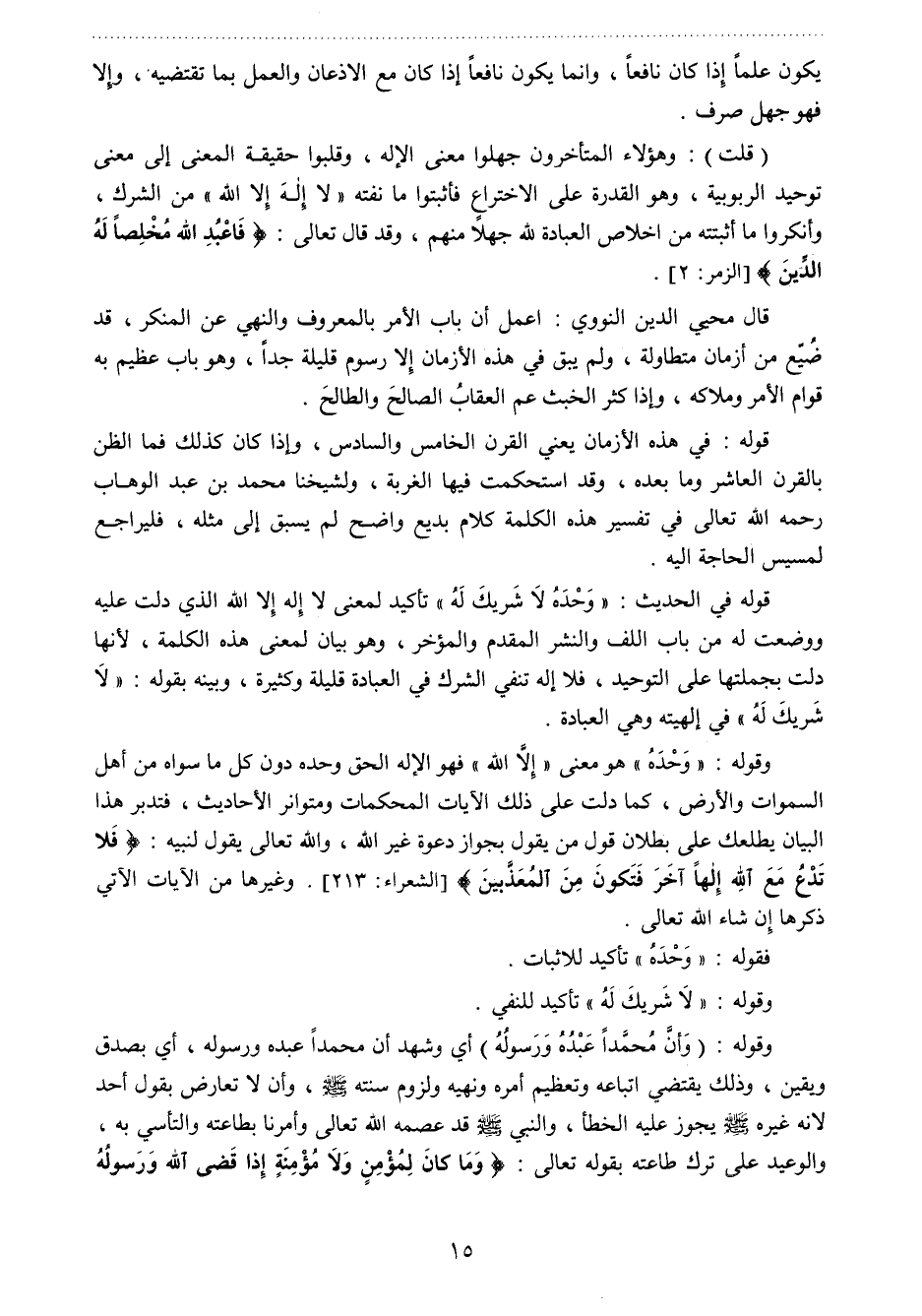 "قلت ": وهؤلاء المتأخرون جهلوا معنى الإله، وقلبوا حقيقة المعنى إلى معنى توحيد الربوبية، وهو القدرة على الاختراع فأثبتوا ما نفته "لا إله إلا الله" من الشرك، وأنكروا ما أثبتته من إخلاص العبادة لله جهلا منهم، وقد قال تعالى: {فَاعْبُدِ اللَّهَ مُخْلِصاً لَهُ الدِّينَ} 1.