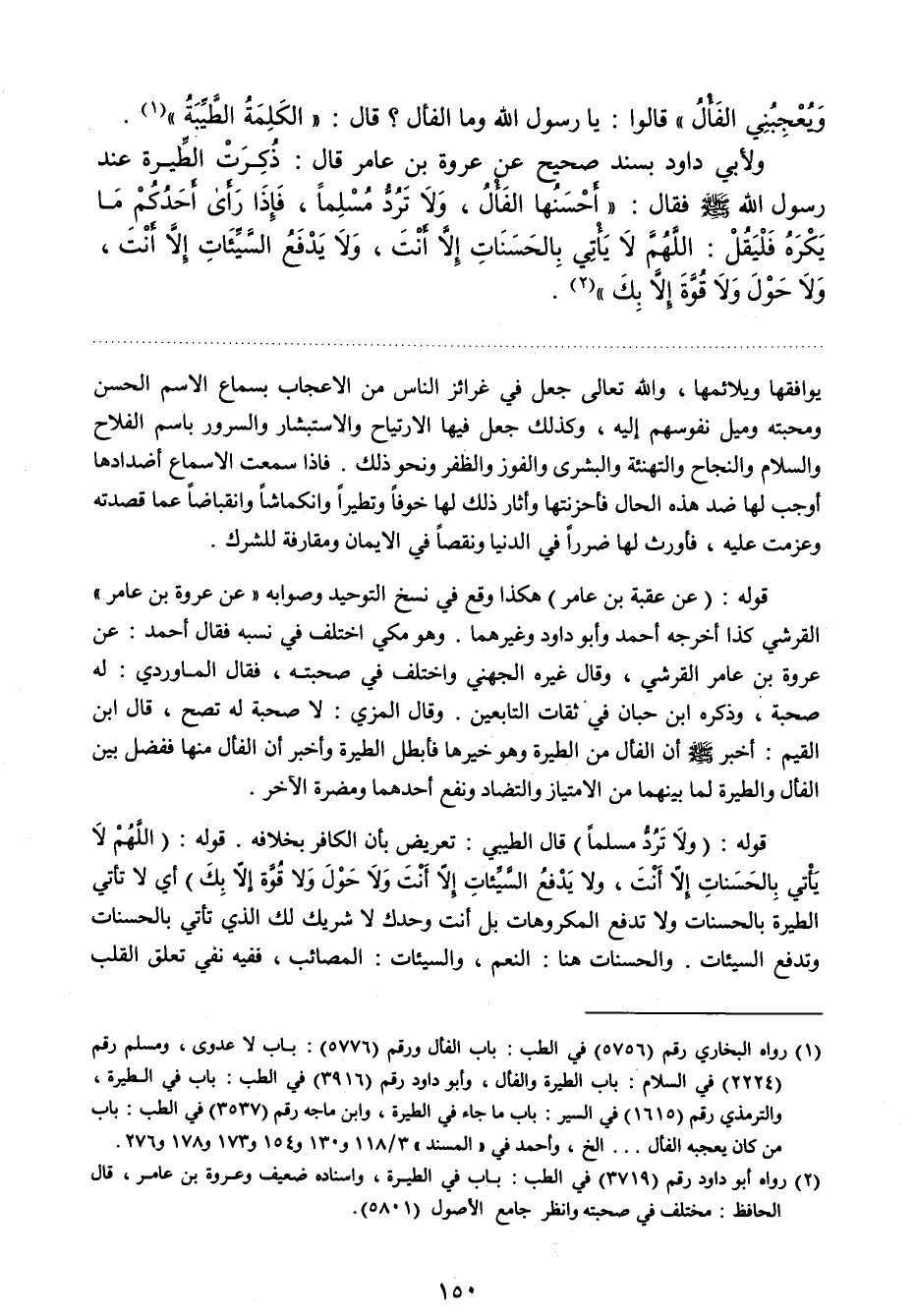 ولأبي داود بسند صحيح عن عروة بن عامر قال: " ذكرت الطيرة عند رسول الله صلي الله عليه وسلم فقال: أحسنها الفأل، ولا ترد مسلما، فإذا رأى أحدكم ما يكره فليقل: اللهم لا يأتي بالحسنات إلا أنت، ولا يدفع السيئات إلا أنت، ولا حول ولا قوة إلا بك "2.