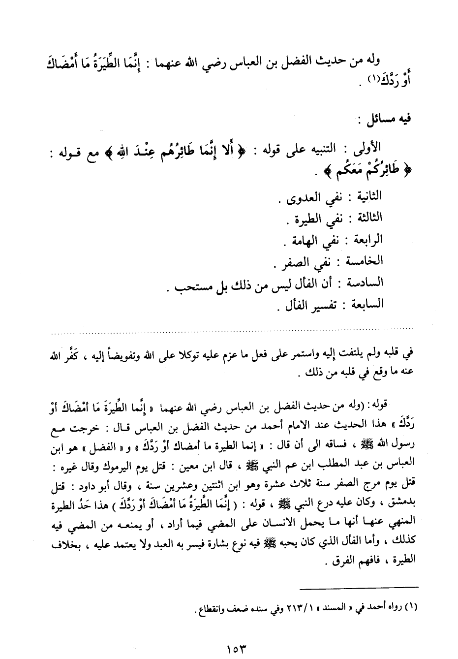 قوله: "وله من حديث الفضل بن العباس - رضي الله عنهما -: " إنما الطيرة ما أمضاك أو ردك "" هذا الحديث عند الإمام أحمد من حديث الفضل بن العباس قال: خرجت مع رسول الله صلي الله عليه وسلم فساقه إلى أن قال: " إنما الطيرة ما أمضاك أو ردك "و " الفضل " هو ابن العباس بن عبد المطلب ابن عم النبي صلي الله عليه وسلم قال ابن معين: قتل يوم اليرموك وقال غيره: قتل يوم مرج الصفر سنة ثلاث عشرة وهو ابن اثنتين وعشرين سنة، وقال أبو داود: قتل بدمشق، وكان عليه درع النبي صلي الله عليه وسلم قوله: " إنما الطيرة ما أمضاك أو ردك "3 هذا حد الطيرة المنهي عنها أنها ما يحمل الإنسان على المضي فيما أراد، أو يمنعه من المضي فيه كذلك، وأما الفأل الذي كان يحبه صلي الله عليه وسلم فيه نوع بشارة فيسر به العبد ولا يعتمد عليه، بخلاف الطيرة، فافهم الفرق.