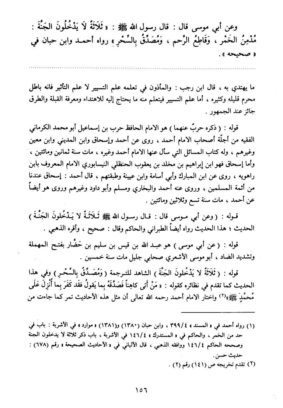 قوله: "ثلاثة لا يدخلون الجنة " الشاهد للترجمة "ومصدق بالسحر " وفي هذا الحديث كما تقدم في نظائره كقوله: " من أتى كاهنا فصدقه بما يقول فقد كفر بما أنزل على محمد صلي الله عليه وسلم "2 واختار الأمام أحمد - رحمه الله تعالى - أن مثل هذه الأحاديث تمر كما جاءت من