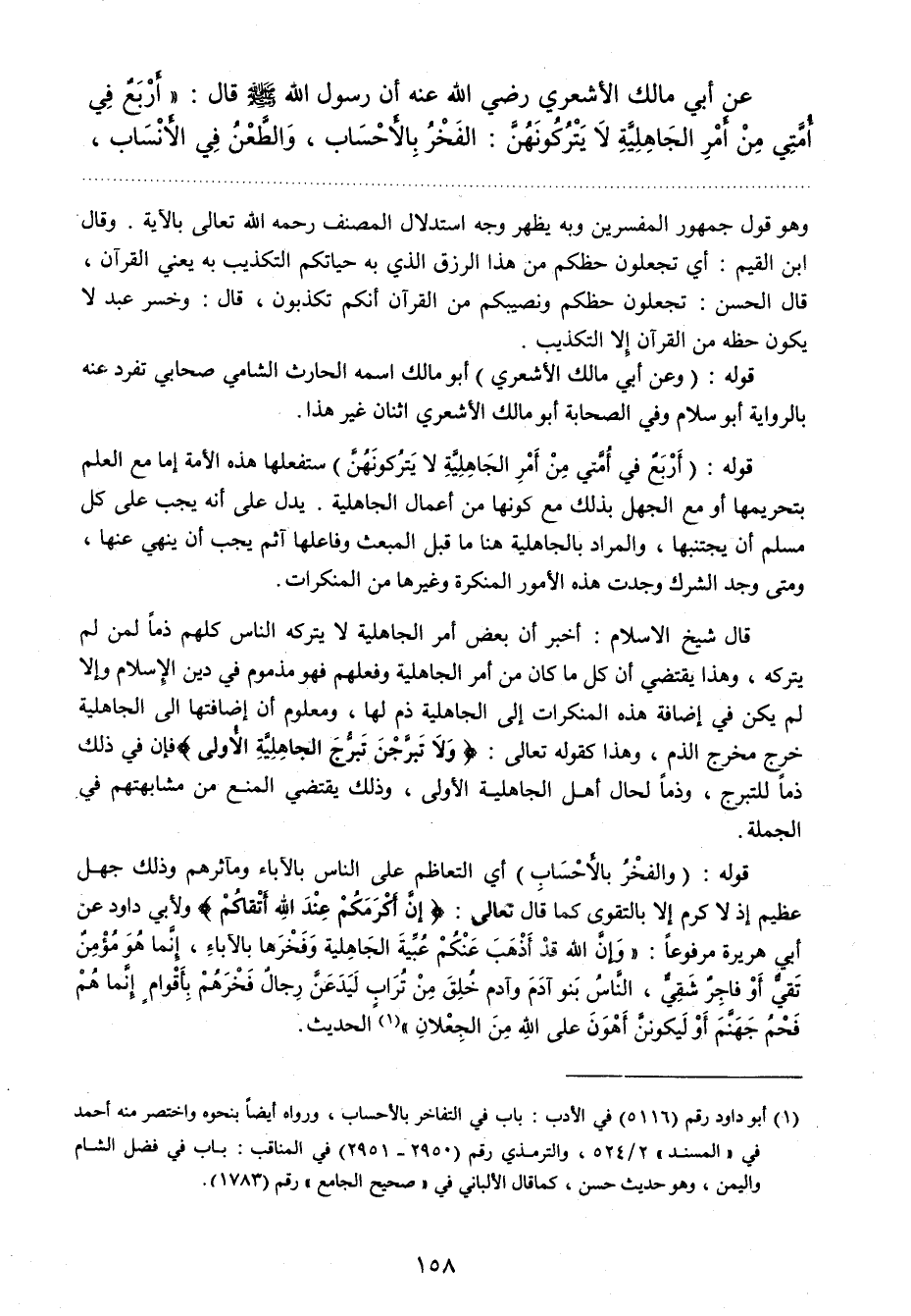 عن أبي مالك الأشعري رضي الله عنه أن رسول الله صلي الله عليه وسلم قال: " أربع في أمتي من أمر الجاهلية لا يتركونهن: الفخر بالأحساب، والطعن في الأنساب،