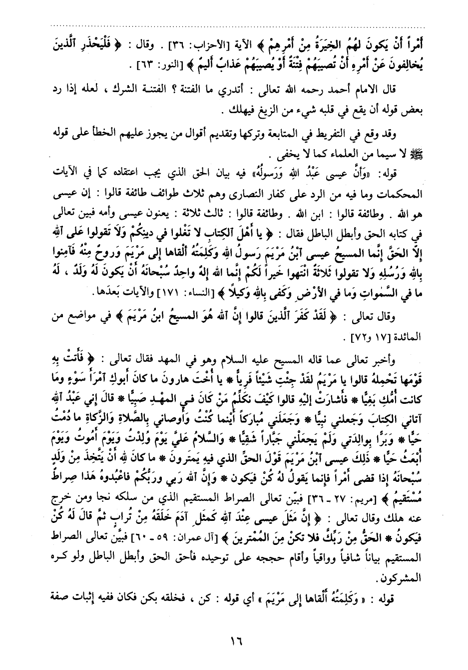 وأخبر تعالى عما قاله المسيح - عليه السلام - وهو في المهد فقال تعالى: {فَأَتَتْ بِهِ قَوْمَهَا تَحْمِلُهُ قَالُوا يَا مَرْيَمُ لَقَدْ جِئْتِ شَيْئاً فَرِيّاً. يَا أُخْتَ هَارُونَ مَا كَانَ أَبُوكِ امْرَأَ سَوْءٍ وَمَا كَانَتْ أُمُّكِ بَغِيّاً. فَأَشَارَتْ إِلَيْهِ قَالُوا كَيْفَ نُكَلِّمُ مَنْ كَانَ فِي الْمَهْدِ صَبِيّاً. قَالَ إِنِّي عَبْدُ اللَّهِ آتَانِيَ الْكِتَابَ وَجَعَلَنِي نَبِيّاً. وَجَعَلَنِي مُبَارَكاً أَيْنَ مَا كُنْتُ وَأَوْصَانِي بِالصَّلاةِ وَالزَّكَاةِ مَا دُمْتُ حَيّاً. وَبَرّاً بِوَالِدَتِي وَلَمْ يَجْعَلْنِي جَبَّاراً شَقِيّاً. وَالسَّلامُ عَلَيَّ يَوْمَ وُلِدْتُ وَيَوْمَ أَمُوتُ وَيَوْمَ أُبْعَثُ حَيّاً. ذَلِكَ عِيسَى ابْنُ مَرْيَمَ قَوْلَ الْحَقِّ الَّذِي فِيهِ يَمْتَرُونَ. مَا كَانَ لِلَّهِ أَنْ يَتَّخِذَ مِنْ وَلَدٍ سُبْحَانَهُ إِذَا قَضَى أَمْراً فَإِنَّمَا يَقُولُ لَهُ كُنْ فَيَكُونُ. وَإِنَّ اللَّهَ رَبِّي وَرَبُّكُمْ فَاعْبُدُوهُ هَذَا صِرَاطٌ مُسْتَقِيمٌ} 5.