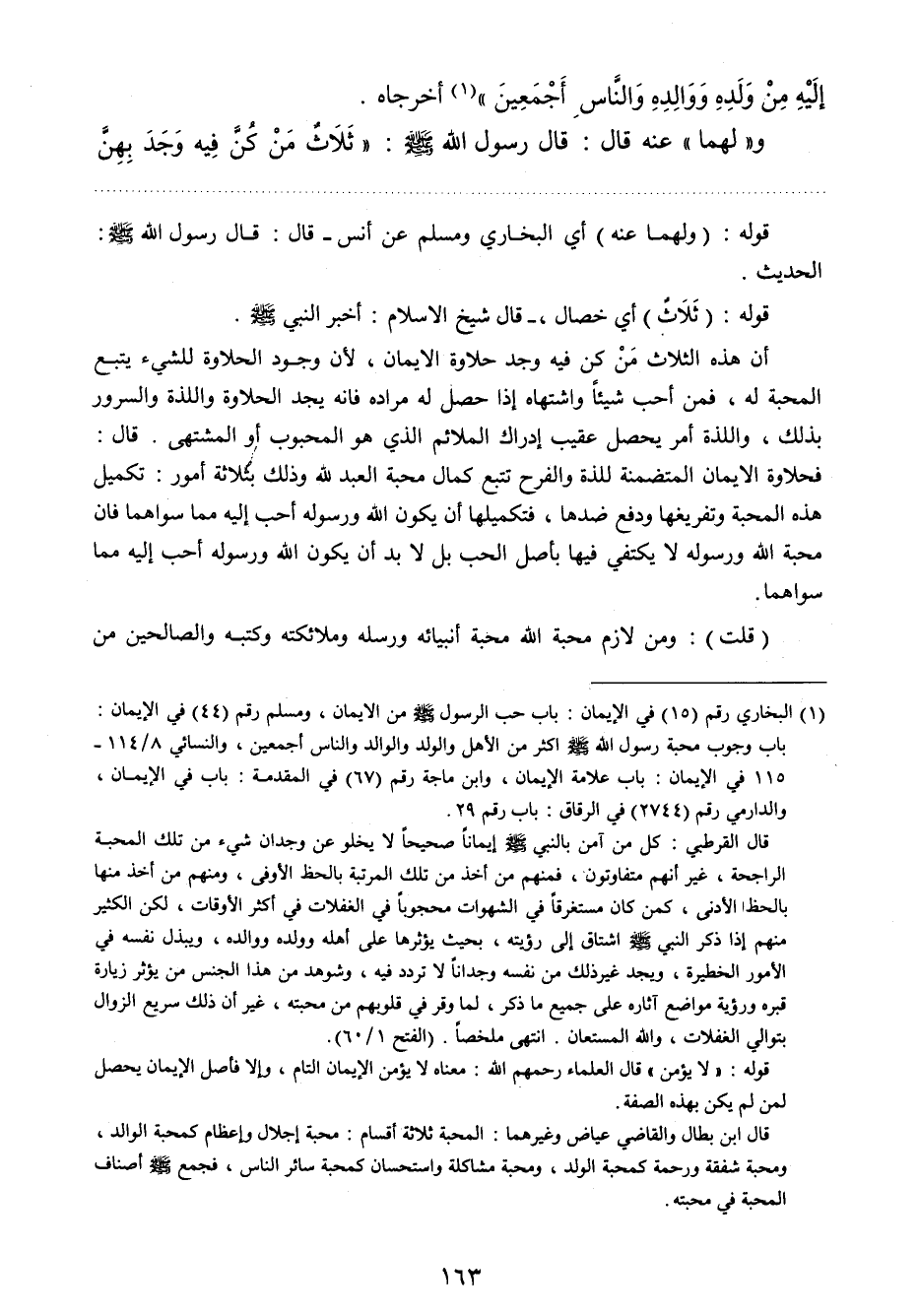 1 البخاري رقم 15 في الإيمان: باب حب الرسول – صلى الله عليه وسلم - من الإيمان ومسلم رقم 44 في الإيمان: باب وجوب محبة الرسول صلى الله عليه وسلم أكثر من الأهل والولد والوالد والناس أجععين , والنسائي 8/ 114- 115 في الإيمان: باب علامة الإيمان , وابن ماجه رقم (67) في المقدمة: باب في الإيمان، والدارمي رقم (2744) في الرقاق: باب رقم 29 0 قال القرطبي: "كل من آمن بالنبي صلى الله عليه وسلم إيمانا صحيحا لا يخلو عن وجدان شيء من تلك المحبة الراجحة , غير أنهم متفاوتون، فمنهم من أخذ من تلك المرتبة بالحظ الأوفى , ومنهم من أخذ منها بالحط الأدنى , كمن كان مستغرقا في الشهوات محجوبا في الغفلات في أكثر الآوقات , لكن الكثير منهم إذا ذكر النبي صلى الله عليه وسلم اشتاق إلى رؤيته , بحيث يؤثرها على أهله وولده ووالده , ويبذل نفسه في الأمور الخطيرة , ويجد غير ذلك من نفسه وجدانا لا تردد فيه , وشوهد من هذا الجنس من يؤثر زيارة قبره ورؤية مواضع آثاره على جميع ما ذكر , لما وقر في قلوبهم من محبته , غير أن ذلك سريع الزوال بتوالي الغفلات , والله المستعان". انتهى ملخصا. (الفتح 1/ 60) . قوله: "لا يؤمن" قال العلماء - رحمهم الله -: معناه لا يؤمن الإيمان التام , وإلا فأصل الإيمان يحصل لمن لم يكن بهذه الصفة. قال ابن بطال والقاضي عياض وغيرهما: المحبة ثلاثة أقسام: محبة إجلال وإعظام كمحبة الوالد، ومحبة شفقة ورحمة كمحبة الولد , ومحبة مشاكلة واستحسان كمحبة سائر الناس، فجمع صلى الله عليه وسلم أصنات المحبة في محبته.