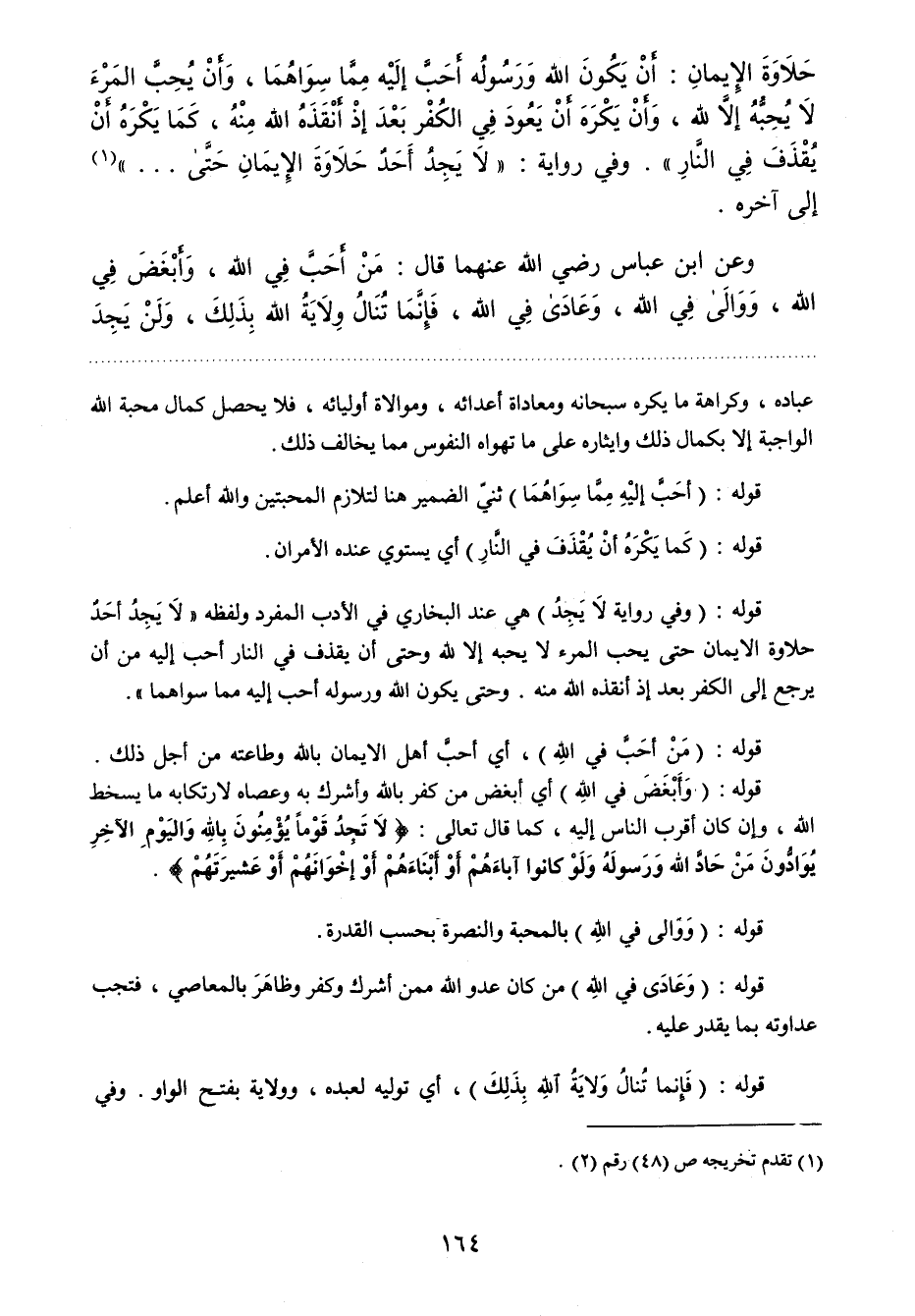 حلاوة الإيمان: أن يكون الله ورسوله أحب إليه مما سواهما، وأن يحب المرء لا يحبه إلا لله، وأن يكره أن يعود في الكفر بعد إذ أنقذه الله منه، كما يكره أن يقذف في النار "وفي رواية: " لا يجد أحد حلاوة الإيمان حتى ... "1 إلى آخره.