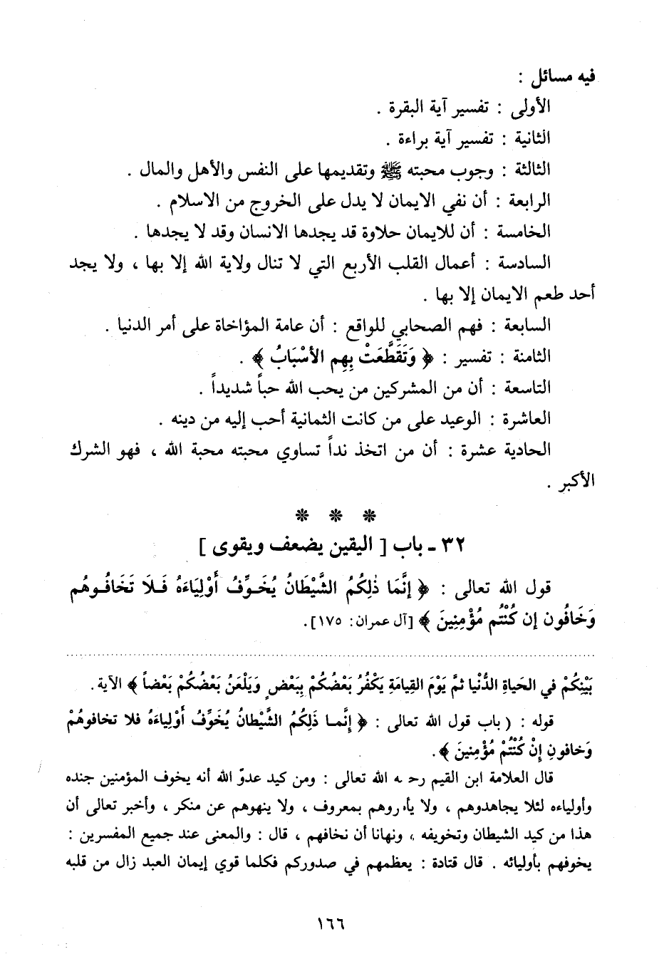 قوله: "باب قول الله تعالى: {إِنَّمَا ذَلِكُمُ الشَّيْطَانُ يُخَوِّفُ أَوْلِيَاءَهُ فَلا تَخَافُوهُمْ وَخَافُونِ إِنْ كُنْتُمْ مُؤْمِنِينَ} 3 قال العلامة ابن القيم - رحمه الله تعالى -: "ومن كيد عدو الله أنه يخوف المؤمنين جنده وأولياءه لئلا يجاهدوهم، ولا يأمروهم بمعروف، ولا ينهوهم عن منكر، وأخبر تعالى أن هذا من كيد الشيطان وتخويفه، ونهانا أن نخافهم، قال: والمعنى عند جميع المفسرين: يخوفهم بأوليائه. قال قتادة: يعظمهم في صدوركم فكلما قوي إيمان العبد زال من قلبه