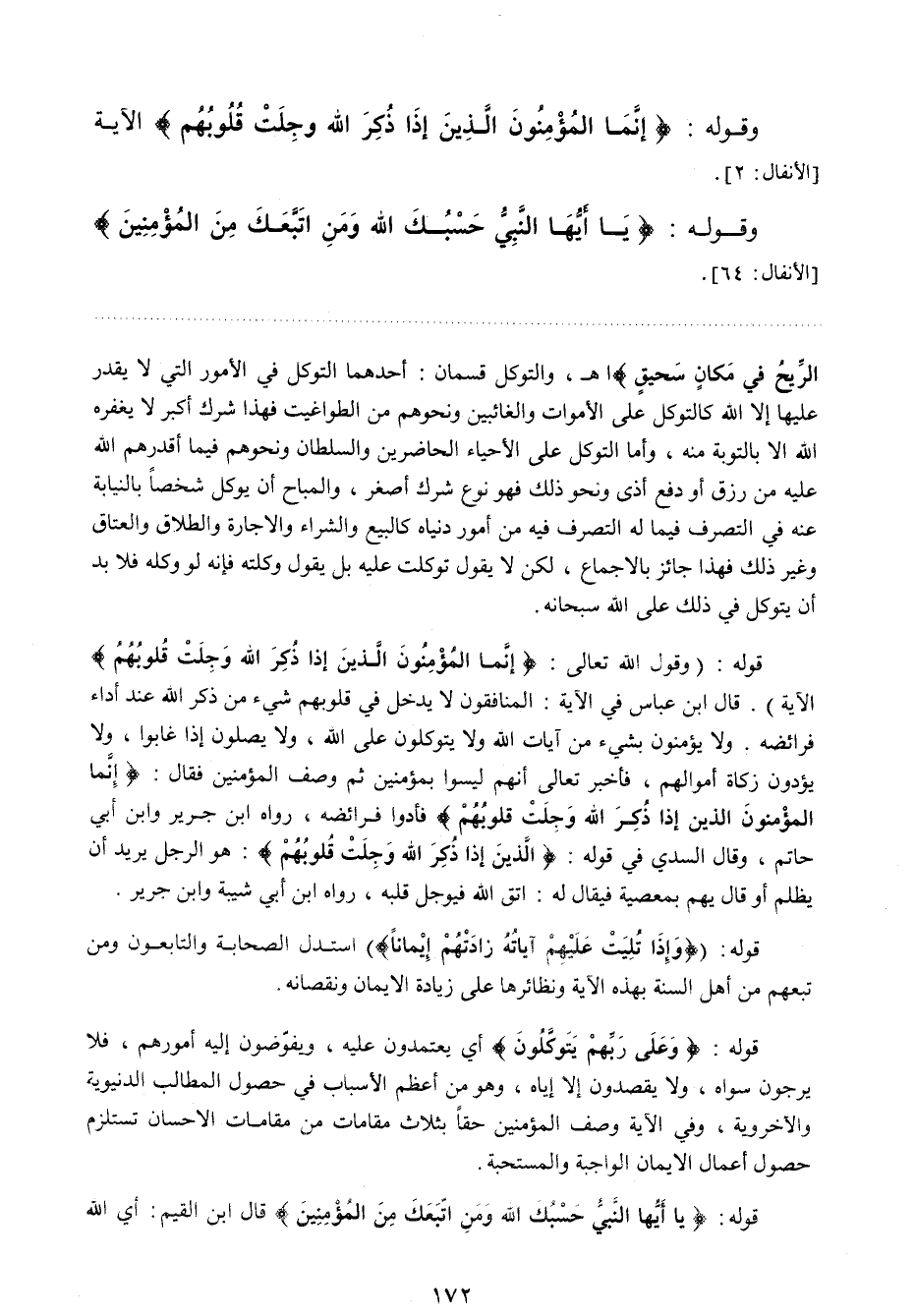 قوله: "وقول الله تعالى: {إِنَّمَا الْمُؤْمِنُونَ الَّذِينَ إِذَا ذُكِرَ اللَّهُ وَجِلَتْ قُلُوبُهُمْ} الآية ". قال ابن عباس في الآية: المنافقون لا يدخل في قلوبهم شيء من ذكر الله عند أداء فرائضه. ولا يؤمنون بشيء من آيات الله ولا يتوكلون على الله، ولا يصلون إذا غابوا، ولا يؤدون زكاة أموالهم، فأخبر تعالى أنهم ليسوا بمؤمنين، ثم وصف المؤمنين فقال: {إِنَّمَا الْمُؤْمِنُونَ الَّذِينَ إِذَا ذُكِرَ اللَّهُ وَجِلَتْ قُلُوبُهُمْ} فأدوا فرائضه، رواه ابن جرير وابن أبي حاتم، وقال السدي في قوله: {الَّذِينَ إِذَا ذُكِرَ اللَّهُ وَجِلَتْ قُلُوبُهُمْ} هو الرجل يريد أن يظلم، أو قال يهم بمعصية فيقال له: اتق الله فيوجل قلبه. رواه ابن أبي شيبة وابن جرير.