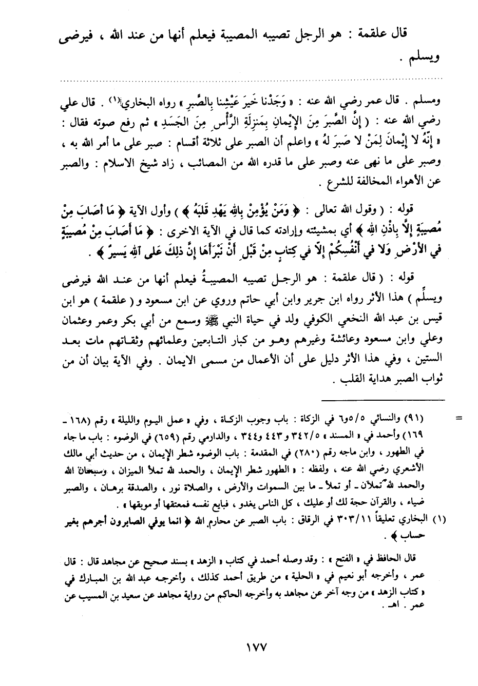 قوله: "وقول الله تعالى: {وَمَنْ يُؤْمِنْ بِاللَّهِ يَهْدِ قَلْبَهُ} 2 " وأول الآية {مَا أَصَابَ مِنْ مُصِيبَةٍ إِلا بِإِذْنِ اللَّهِ} 3 أي بمشيئته وإرادته كما قال في الآية الأخرى: {مَا أَصَابَ مِنْ مُصِيبَةٍ فِي الْأَرْضِ وَلا فِي أَنْفُسِكُمْ إِلا فِي كِتَابٍ مِنْ قَبْلِ أَنْ نَبْرَأَهَا إِنَّ ذَلِكَ عَلَى اللَّهِ يَسِيرٌ} 4 قوله: "قال علقمة: هو الرجل تصيبه المصيبة فيعلم أنها من عند الله فيرضى ويسلم " هذا الأثر رواه ابن جرير وابن أبي حاتم وروي عن ابن مسعود. و "علقمة " هو ابن قيس بن عبد الله النخعي الكوفي، ولد في حياة النبي صلي الله عليه وسلم، وسمع من أبي بكر وعمر وعثمان وعلي وابن مسعود وعائشة وغيرهم، وهو من كبار التابعين وعلمائهم وثقاتهم، مات بعد الستين. وفي هذا الأثر دليل على أن الأعمال من مسمى الإيمان.