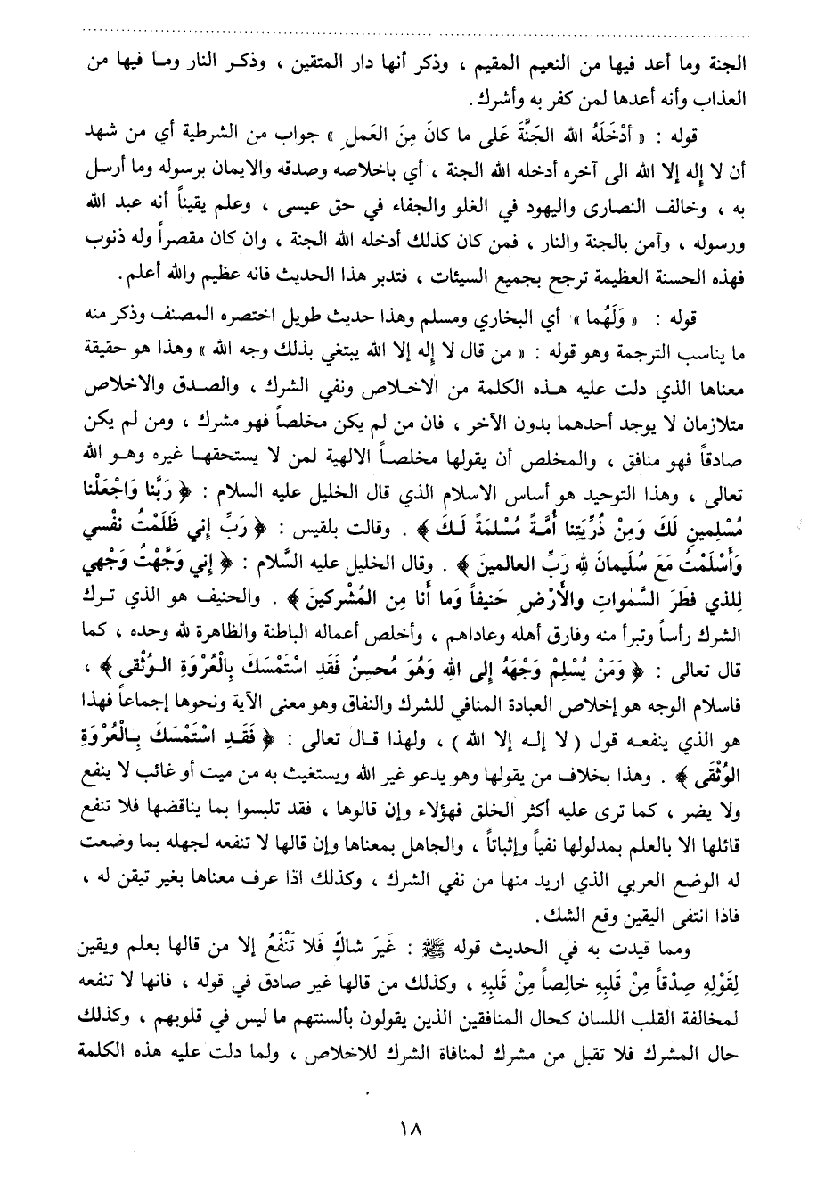 قوله: "ولهما" أي البخاري ومسلم وهذا حديث طويل اختصره المصنف وذكر منه ما يناسب الترجمة وهو قوله: "من قال لا إله إلا الله يبتغي بذلك وجه الله"، وهذا هو حقيقة معناها الذي دلت عليه هذه الكلمة من الإخلاص ونفي الشرك، والصدق والإخلاص متلازمان لا يوجد أحدهما بدون الآخر، فإن من لم يكن مخلصا فهو مشرك، ومن لم يكن صادقا فهو منافق، والمخلص أن يقولها مخلصا الإلهية لمن لا يستحقها غيره وهو الله تعالى، وهذا التوحيد هو أساس الإسلام الذي قال الخليل عليه السلام: {رَبَّنَا وَاجْعَلْنَا مُسْلِمَيْنِ لَكَ} 1. وقالت بلقيس: {رَبِّ إِنِّي ظَلَمْتُ نَفْسِي وَأَسْلَمْتُ مَعَ سُلَيْمَانَ} 2، وقال الخليل عليه السلام: {إِنِّي وَجَّهْتُ وَجْهِيَ لِلَّذِي فَطَرَ السَّمَاوَاتِ وَالأَرْضَ حَنِيفاً وَمَا أَنَا مِنَ الْمُشْرِكِينَ} 3 والحنيف هو الذي ترك الشرك رأسا وتبرأ معه وفارق أهله وعاداهم، وأخلص أعماله الباطنة والظاهرة لله وحده، كما قال تعالى: {وَمَنْ يُسْلِمْ وَجْهَهُ إِلَى اللَّهِ وَهُوَ مُحْسِنٌ فَقَدِ اسْتَمْسَكَ بِالْعُرْوَةِ الْوُثْقَى} 4 فإسلام الوجه هو إخلاص العبادة المنافي للشرك والنفاق وهو معنى الآية ونحوها إجماعا، فهذا هو الذي ينفعه قول: "لا إله إلا الله "، ولهذا قال تعالى: {فَقَدِ اسْتَمْسَكَ بِالْعُرْوَةِ الْوُثْقَى} 5، وهذا بخلاف من يقولها وهو يدعو غير الله ويستغيث به من ميت أو غائب لا ينفع ولا يضر، كما ترى عليه أكثر الخلق فهؤلاء وإن قالوها، فقد تلبسوا بما يناقضها فلا تنفع قائلها إلا بالعلم بمدلولها نفيا وإثباتا، والجاهل بمعناها وإن قالها لا تنفعه لجهله بما وضعت له الوضع العربي الذي أريد منها من نفي الشرك، وكذلك إذا عرف معناها بغير تيقن له، فإذا انتفى اليقين وقع الشك.