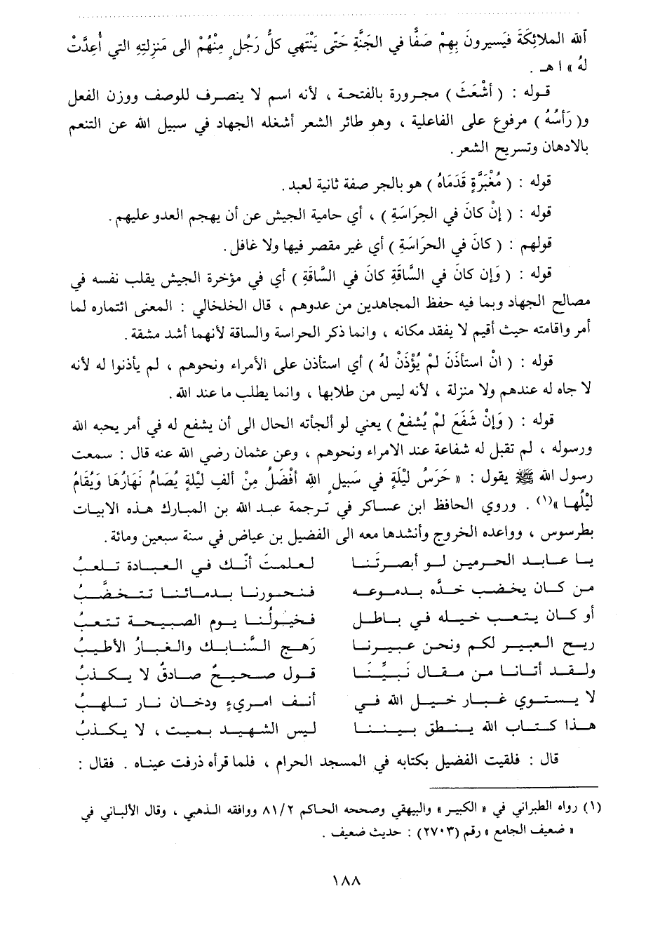 قوله: " وإن شفع لم يشفع" يعني لو ألجأته الحال إلى أن يشفع له في أمر يحبه الله ورسوله، لم تقبل له شفاعة عند الأمراء ونحوهم. وعن عثمان رضي الله عنه قال: سمعت رسول الله صلي الله عليه وسلم يقول: " حرس ليلة في سبيل الله أفضل من ألف ليلة يصام نهارها ويقام ليلها "1 وروى الحافظ ابن عساكر في ترجمة عبد الله بن المبارك هذه الأبيات بطرسوس، وواعده الخروج وأنشدها معه إلى الفضيل بن عياض في سنة سبعين ومائة.