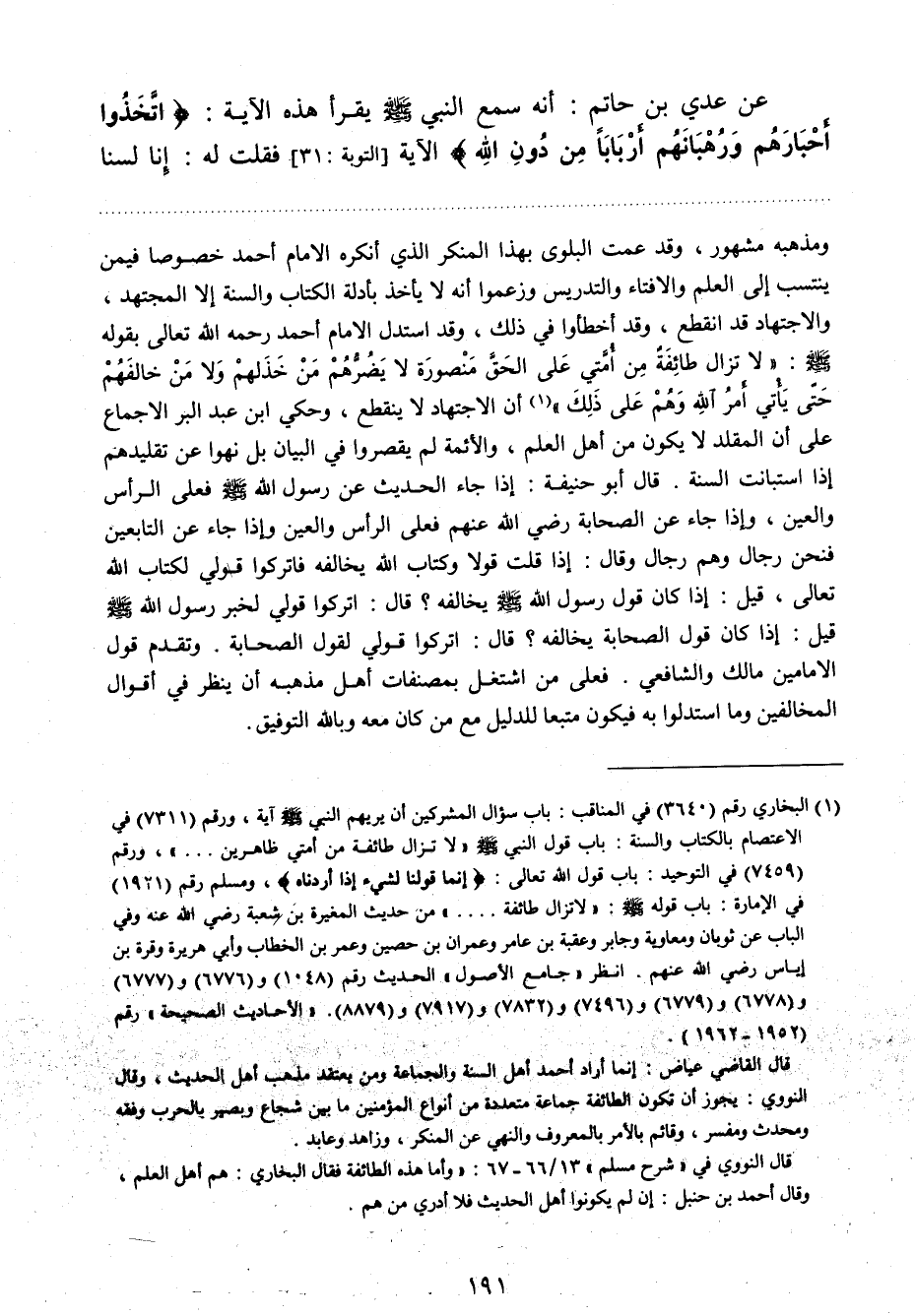 2 البخاري رقم (3640) في المناقب: باب سؤال المشركين أن يريهم النبي صلى الله عليه وسلم آية , ورقم (7311) في الاعتصام بالكتاب والسنة: باب قول النبي صلى الله عليه وسلم: " لا تزال طائقة من أمتي ظاهربن" ورقم (7459) في التوحيد: باب قول الله تعالى: (إنما قولنا لشيء إذا أردناه) , ومسلم رقم (1921) في الإمارة: باب قوله صلى الله عليه وسلم: " لاتزال طائقة...." من حديث المغيرة بن شعبة - رضي الله عنه -، وفي الباب عن ثوبان ومعاوية وجابر وعقبة بن عامر وعمران بن حصين وعمر بن الخطاب وأبو هريرة وقرة بن إياس رضي الله عنهم 0 انظر: جامع الأصول الحديث رقم (1048) و (6776) و (6777) و (6778) و (6779) و (7496) و (7832) و (7917) و (8879) 0الأحاديث الصحيحة رقم (1952 - 1962) . قال القاضي عياض: إنما أراد أحمد أهل السنة والجماعة ومن يعتقد مذهب أهل الحديث. وقال النووي: يجوز أن تكون الطائفة جماعة متعددة من أنواع المؤمنين ما بين شجاع وبصير بالحرب وفقيه ومحدث ومفسر , وقائم بالأمر بالمعروف والنهي عن المنكر , وزاهد وعابد. قال النووي في " شرح مسلم 13/66 - 67: "وأما هذه الطائفة فقال البخاري: هم أهل العلم وقال أحمد بن حنيل: إن لم يكونوا اهل الحديث فلا أدري من هم".