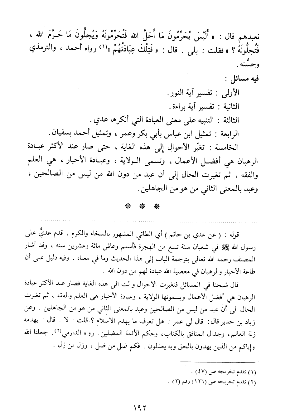 نعبدهم قال: أليس يحرمون ما أحل الله فتحرمونه، ويحلون ما حرم الله فتحلونه؟ فقلت: بلى. قال: فتلك عبادتهم "1 رواه أحمد، والترمذي وحسنه.