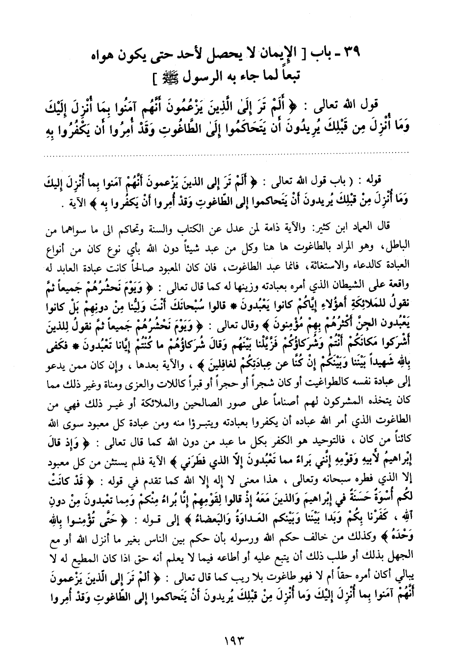 قوله: "باب قول الله تعالى: {أَلَمْ تَرَ إِلَى الَّذِينَ يَزْعُمُونَ أَنَّهُمْ آمَنُوا بِمَا أُنْزِلَ إِلَيْكَ وَمَا أُنْزِلَ مِنْ قَبْلِكَ يُرِيدُونَ أَنْ يَتَحَاكَمُوا إِلَى الطَّاغُوتِ وَقَدْ أُمِرُوا أَنْ يَكْفُرُوا بِهِ} 1 " الآية.