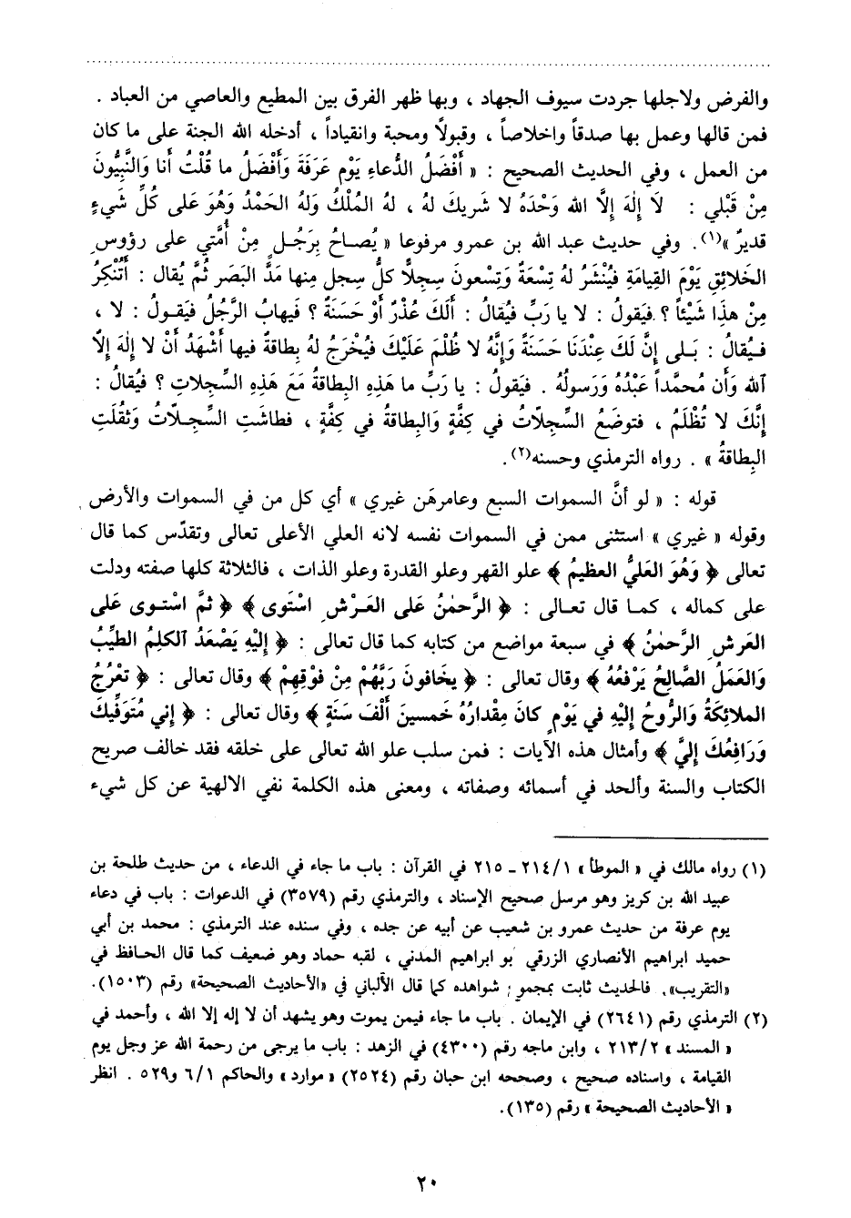 2 الترمذي رقم (2641) في الإيمان: باب ما جاء فيمن يموت وهو يشهد أن لا إله إلا الله , وأحمد في "المسند" 2/ 213 , وابن ماجه رقم (4300) في الزهد: باب ما يرجى من رحمة الله عز وجل يوم القيامة , وإسناده صحيح , وصححه ابن حبان رقم (2524) "موارد"، والحاكم 1 / 6 و 529. انظر " الأحاديث الصحيحة " رقم (135) .