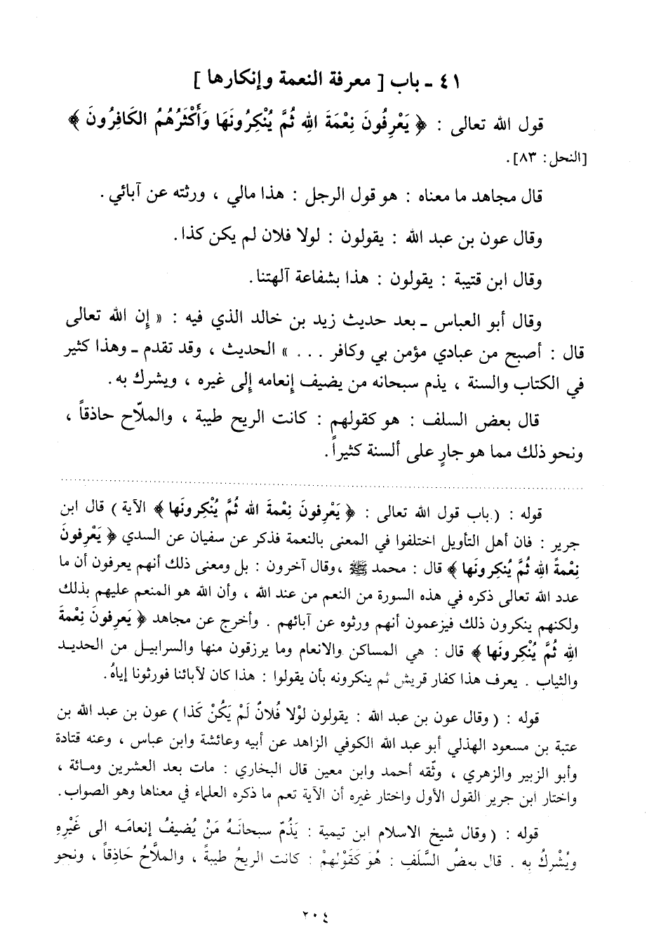قوله: "باب قول الله تعالى: {يَعْرِفُونَ نِعْمَتَ اللَّهِ ثُمَّ يُنْكِرُونَهَا} الآية " قال ابن جرير: فإن أهل التأويل اختلفوا في المعني بالنعمة فذكر عن سفيان عن السدي " يَعْرِفُونَ نِعْمَتَ اللَّهِ ثُمَّ يُنْكِرُونَهَا "قال: محمد صلي الله عليه وسلم. وقال آخرون: بل ومعنى ذلك أنهم يعرفون أن ما عدد الله تعالى ذكره في هذه السورة من النعم من عند الله، وأن الله هو المنعم عليهم بذلك، ولكنهم ينكرون ذلك فيزعمون أنهم ورثوه عن آبائهم.