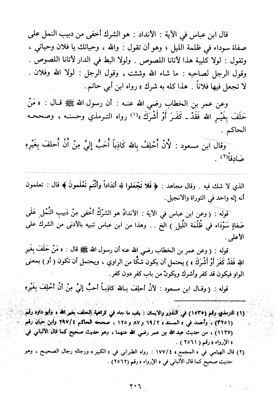 قوله: "وعن ابن عباس في الآية: " الأنداد هو الشرك أخفى من دبيب النمل على صفاة سوداء في ظلمة الليل "" إلخ.. وهذا من ابن عباس تنبيه بالأدنى من الشرك على الأعلى.