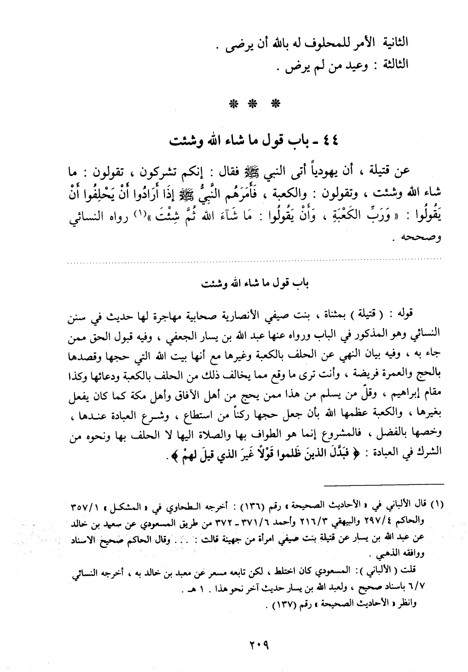 عن قتيلة " أن يهوديا أتى النبي صلي الله عليه وسلم فقال: إنكم تشركون، تقولون: ما شاء الله وشئت، وتقولون: والكعبة، فأمرهم النبي صلي الله عليه وسلم إذا أرادوا أن يحلفوا أن يقولوا: ورب الكعبة، وأن يقولوا: ما شاء الله ثم شئت "1 رواه النسائي وصححه.