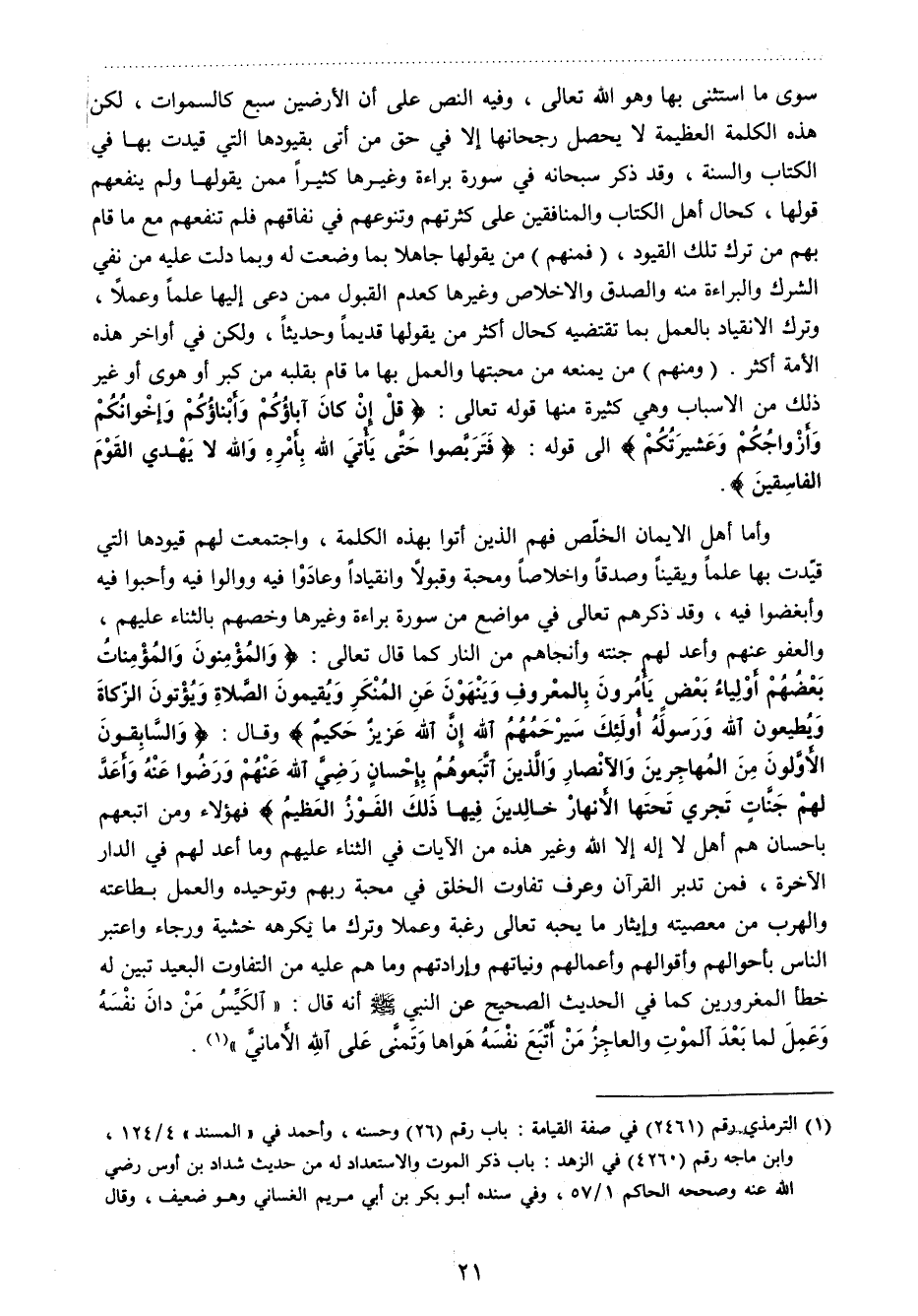 وأما أهل الايمان الخلص فهم الذين أتوا بهذه الكلمة، واجتمعت لهم قيودها التي قيدت بها علما ويقينا وصدقا وإخلاصا ومحبة وقبولا وانقيادا، وعادوا فيه ووالوا فيه وأحبوا فيه وأبغضوا فيه، وقد ذكرهم تعالى في مواضع من سورة براءة وغيرها وخصهم بالثناء عليهم، والعفو عنهم، وأعد لهم جنته وأنجاهم من النار كما قال تعالى: {وَالْمُؤْمِنُونَ وَالْمُؤْمِنَاتُ بَعْضُهُمْ أَوْلِيَاءُ بَعْضٍ يَأْمُرُونَ بِالْمَعْرُوفِ وَيَنْهَوْنَ عَنِ الْمُنْكَرِ وَيُقِيمُونَ الصَّلاةَ وَيُؤْتُونَ الزَّكَاةَ وَيُطِيعُونَ اللَّهَ وَرَسُولَهُ أُولَئِكَ سَيَرْحَمُهُمُ اللَّهُ إِنَّ اللَّهَ عَزِيزٌ حَكِيمٌ} 3، وقال: {وَالسَّابِقُونَ الأَوَّلُونَ مِنَ الْمُهَاجِرِينَ وَالأَنْصَارِ وَالَّذِينَ اتَّبَعُوهُمْ بِإِحْسَانٍ رَضِيَ اللَّهُ عَنْهُمْ وَرَضُوا عَنْهُ وَأَعَدَّ لَهُمْ جَنَّاتٍ تَجْرِي تَحْتَهَا الأَنْهَارُ خَالِدِينَ فِيهَا أَبَداً ذَلِكَ الْفَوْزُ الْعَظِيمُ} 4 فهؤلاء ومن اتبعهم بإحسان هم أهل لا إله إلا الله وغير هذه من الآيات في الثناء عليهم وما أعد لهم في الدار الآخرة، فمن تدبر القرآن وعرف تفاوت الخلق في محبة ربهم وتوحيده والعمل بطاعته والهرب من معصيته، وإيثار ما يحبه تعالى رغبة وعملا وترك ما يكرهه خشية ورجاء، واعتبر الناس بأحوالهم وأقوالهم وأعمالهم ونياتهم وإرادتهم وما هم عليه من التفاوت البعيد تبين له خطأ المغرورين كما في الحديث الصحيح عن النبي صلي الله عليه وسلم أنه قال: " الكيس من دان نفسه وعمل لما بعد الموت، والعاجز من أتبع نفسه هواها وتمنى على الله الأماني " 5.