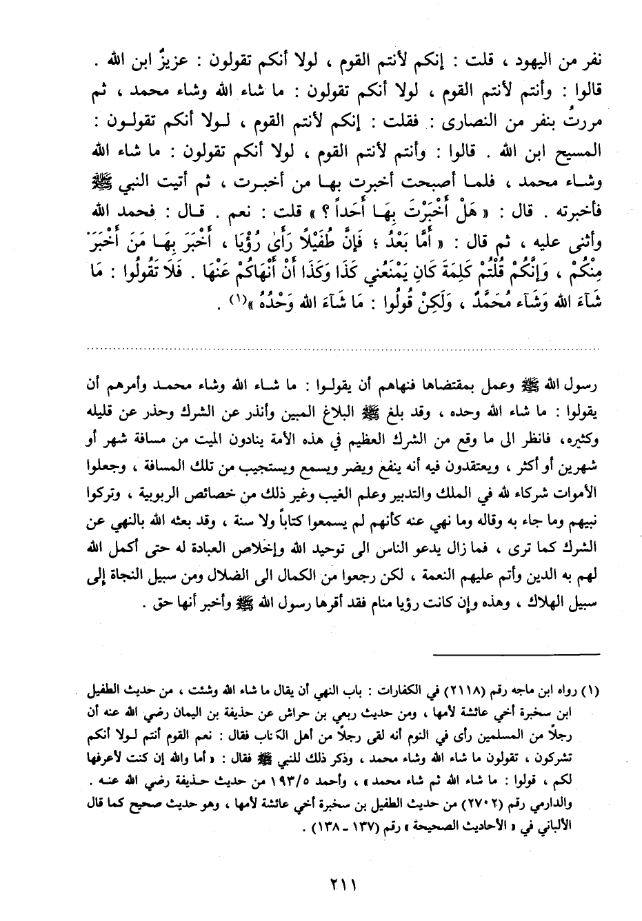 نفر من اليهود، قلت: إنكم لأنتم القوم لولا أنكم تقولون: عزير ابن الله. قالوا: وأنتم لأنتم القوم لولا أنكم تقولون: ما شاء الله وشاء محمد، ثم مررت بنفر من النصارى فقلت: إنكم لأنتم القوم لولا أنكم تقولون: المسيح ابن الله. قالوا: وأنتم لأنتم القوم لولا أنكم تقولون: ما شاء الله وشاء محمد، فلما أصبحت أخبرت بها من أخبرت، ثم أتيت النبي صلي الله عليه وسلم فأخبرته. قال: هل أخبرت بها أحدا؟ قلت: نعم. قال: فحمد الله وأثنى عليه، ثم قال: أما بعد؛ فإن طفيلا رأى رؤيا، أخبر بها من أخبر منكم، وإنكم قلتم كلمة كان يمنعني كذا وكذا أن أنهاكم عنها، فلا تقولوا: ما شاء الله وشاء محمد، ولكن قولوا: ما شاء الله وحده " 1.