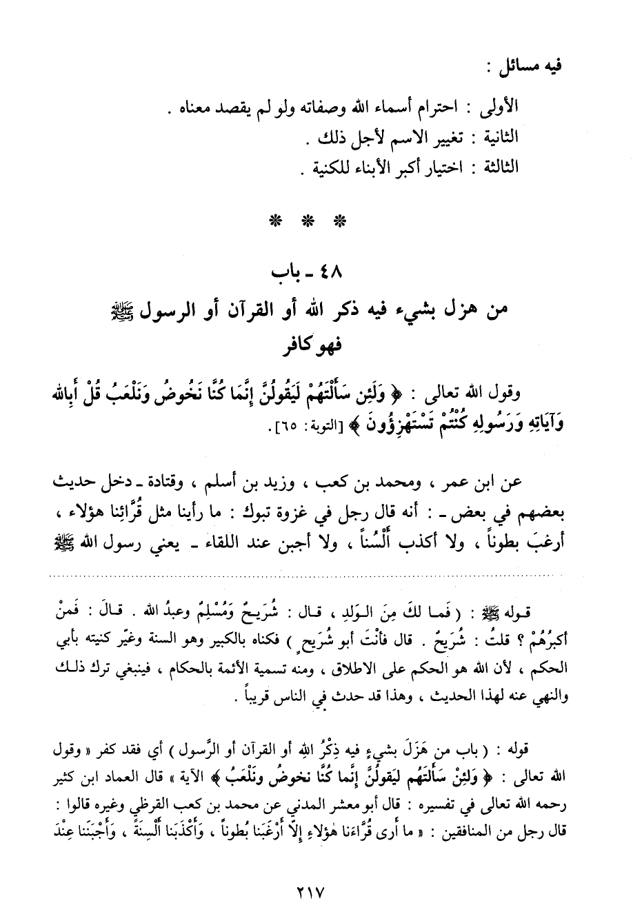 48- باب من هزل بشيء فيه ذكر الله أو القرآن أو الرسول صلي الله عليه وسلم فهو كافر