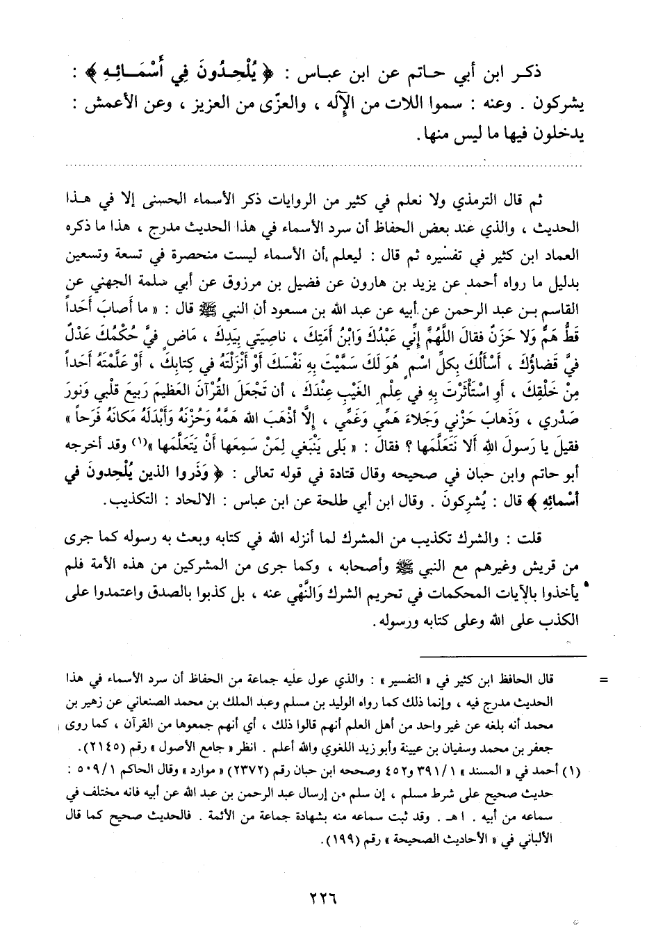 ثم قال الترمذي ولا نعلم في كثير من الروايات ذكر الأسماء الحسنى إلا في هذا الحديث، والذي عند بعض الحفاظ أن سرد الأسماء في هذا الحديث مدرج، هذا ما ذكره العماد ابن كثير في تفسيره ثم قال: ليعلم أن الأسماء ليست منحصرة في تسعة وتسعين بدليل ما رواه أحمد عن يزيد بن هارون عن فضيل بن مرزوق عن أبي سلمة الجهني عن القاسم بن عبد الرحمن عن أبيه عن عبد الله بن مسعود أن النبي صلي الله عليه وسلم قال: " ما أصاب أحدا قط هم ولا حزن فقال: اللهم إني عبدك وابن أمتك، ناصيتي بيدك، ماضٍ فيَّ حكمك عدل فيَّ قضاؤك، أسألك بكل اسم هو لك سميت به نفسك أو أنزلته في كتابك، أو علمته أحدا من خلقك، أو استأثرت به في علم الغيب عندك، أن تجعل القرآن العظيم ربيع قلبي ونور صدري، وذهاب حزني وجلاء همي وغمي، إلا أذهب الله همه وحزنه وأبدله مكانه فرحا، فقيل: يا رسول الله ألا نتعلمها؟ فقال: بلى ينبغي لمن سمعها أن يتعلمها " 1 2، وقد أخرجه أبو حاتم وابن حبان في صحيحه. وقال قتادة في قوله تعالى: {وَذَرُوا الَّذِينَ يُلْحِدُونَ فِي أَسْمَائِهِ} قال: يشركون. وقال ابن أبي طلحة عن ابن عباس: " الإلحاد: التكذيب ".