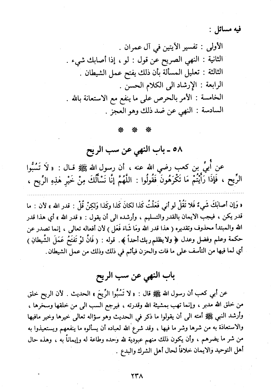 عن أبي بن كعب أن رسول الله صلي الله عليه وسلم قال: "لا تسبوا الريح " الحديث. لأن الريح خلق من خلق الله مدبر، وإنما تهب بمشيئة الله وقدرته، فيرجع السب إلى من خلقها وسخرها، وأرشد النبي صلي الله عليه وسلم أمته إلى أن يقولوا ما ذكر في الحديث، وهو سؤاله تعالى خيرها وخير ما فيها والاستعاذة به من شرها وشر ما فيها، وقد شرع الله لعباده أن يسألوه ما ينفعهم ويستعيذوا به من شر ما يضرهم، وأن يكون ذلك منهم عبودية لله وحده وطاعة له وإيمانا به، وهذه حال أهل التوحيد والإيمان خلافا لحال أهل الشرك والبدع.